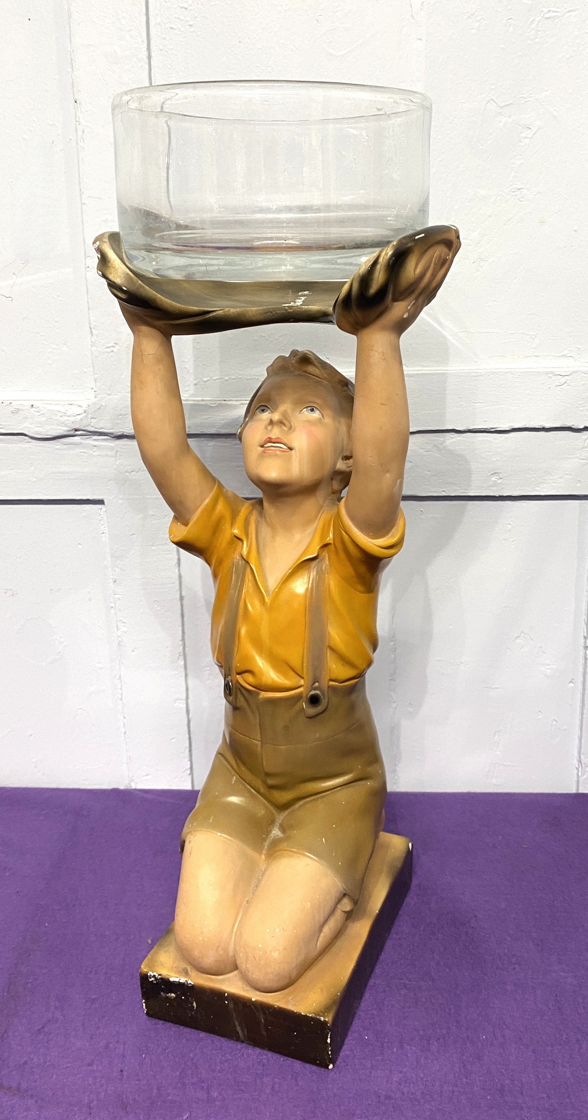 A vintage Art Deco plaster shop retail display figure in the form of a kneeling boy with raised hands 61cm high, with associated glass bowl