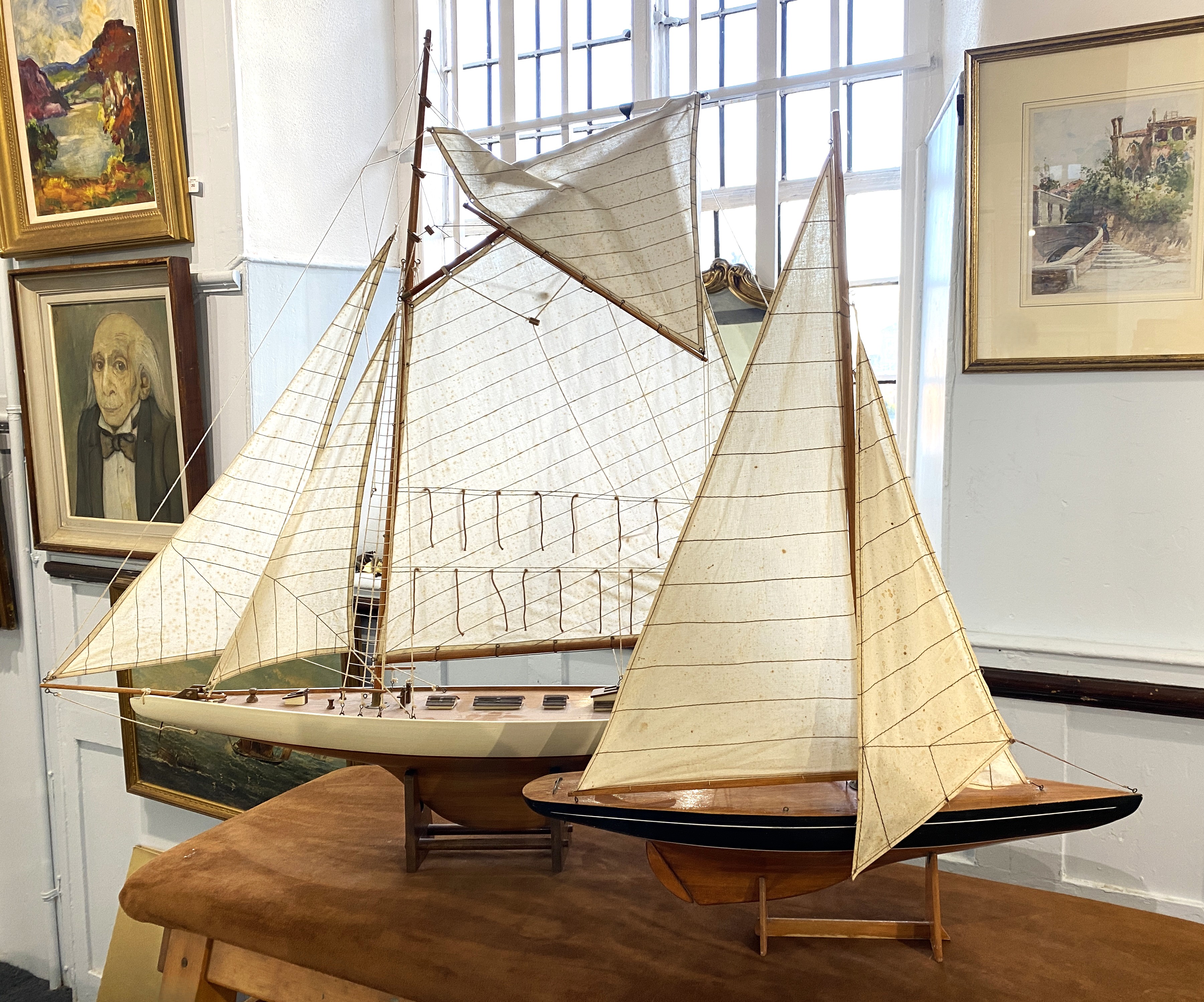 A Nauticalia London painted wooden model yacht on stand, 103cm high, 119cm wide, and another smaller wooden model yacht (a/f)