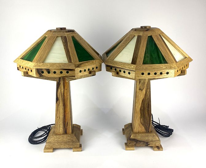 A pair of table lamps in the American Arts & Crafts style of Frank Lloyd Wright (1867 - 1959), modern construction, walnut and coloured glass, 56cm high.