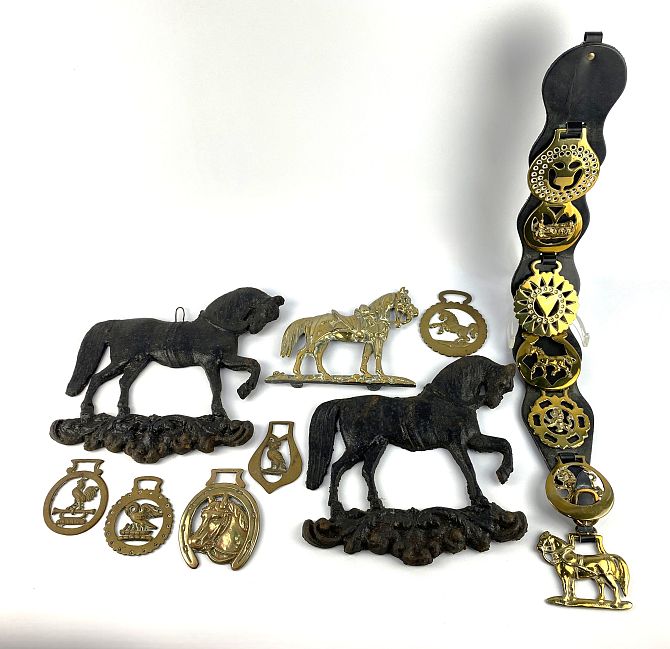 A mixed collection of horse brasses, including; a pair of cast metal horse wall plaques and mixed brasses