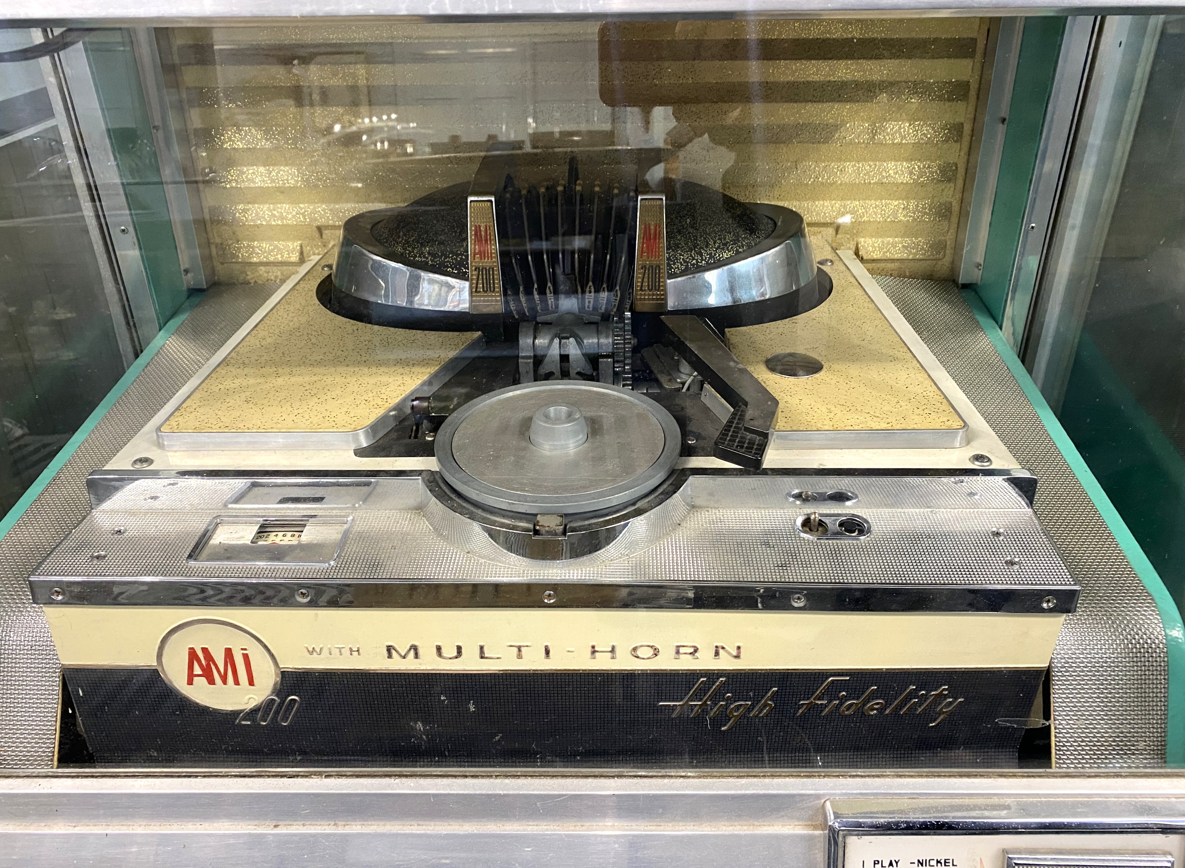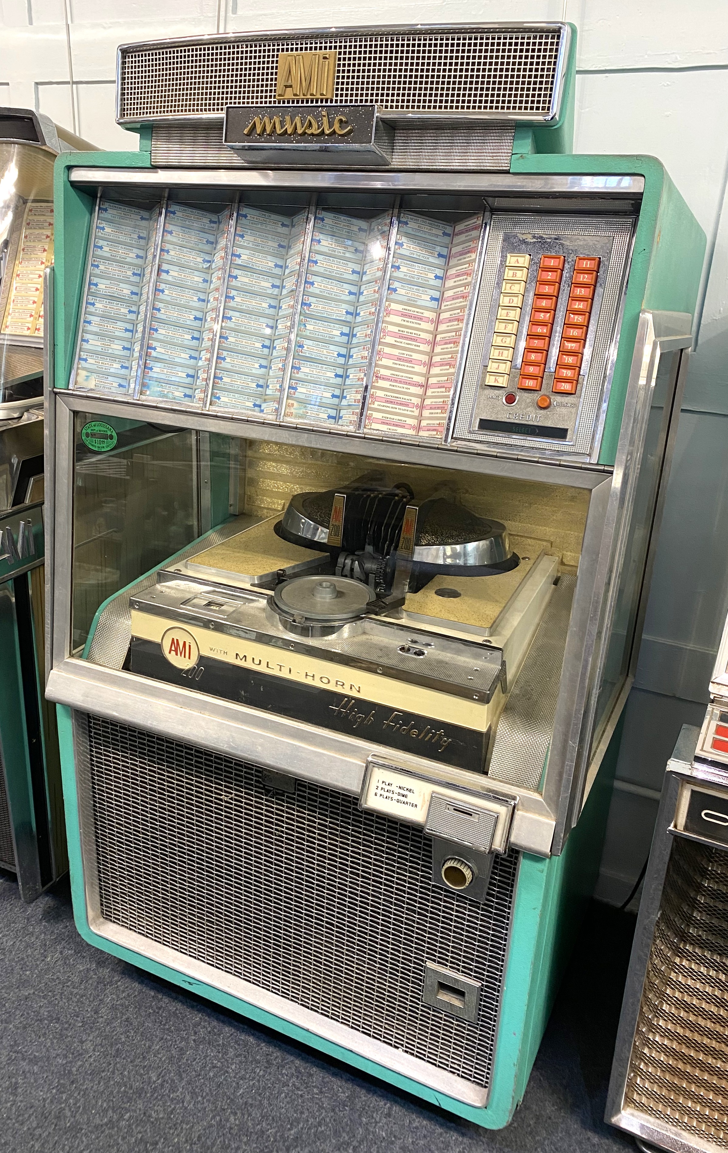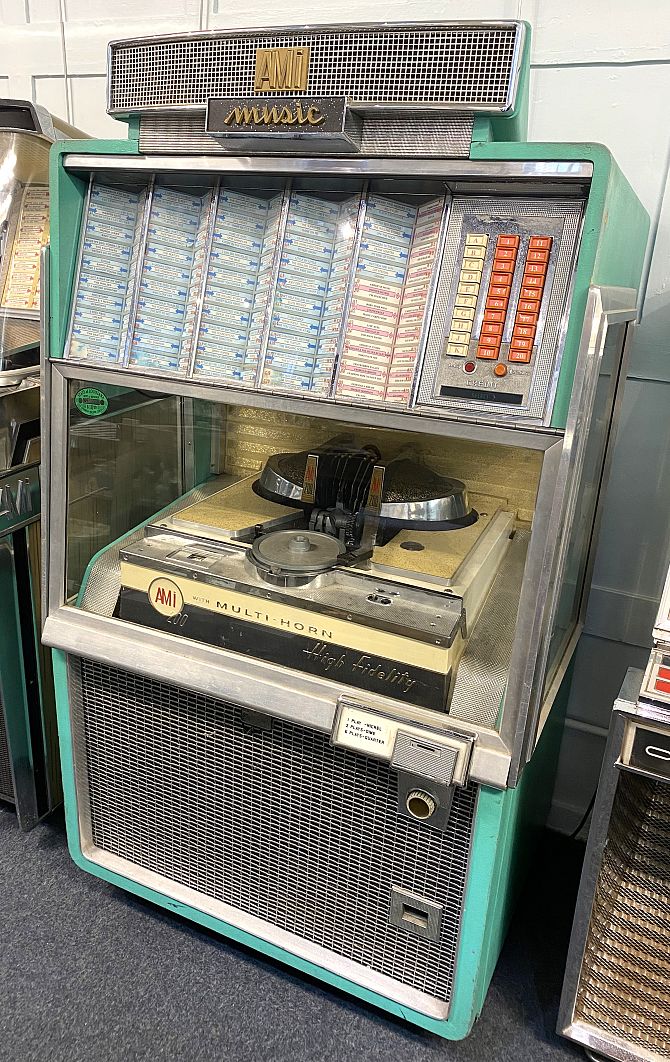 A c.1956 AMi 200 juke box with multi horn, high fidelity, the soft green painted and chrome mounted cabinet inset with clear glass panels, appears in good original condition, (BAL-AMi was the biggest British manufacturer and distributor of jukeboxes in the golden rock 'n' roll era of the mid 1950's through to the early 1960's), 160cm high by 89cm wide by 71cm deep.