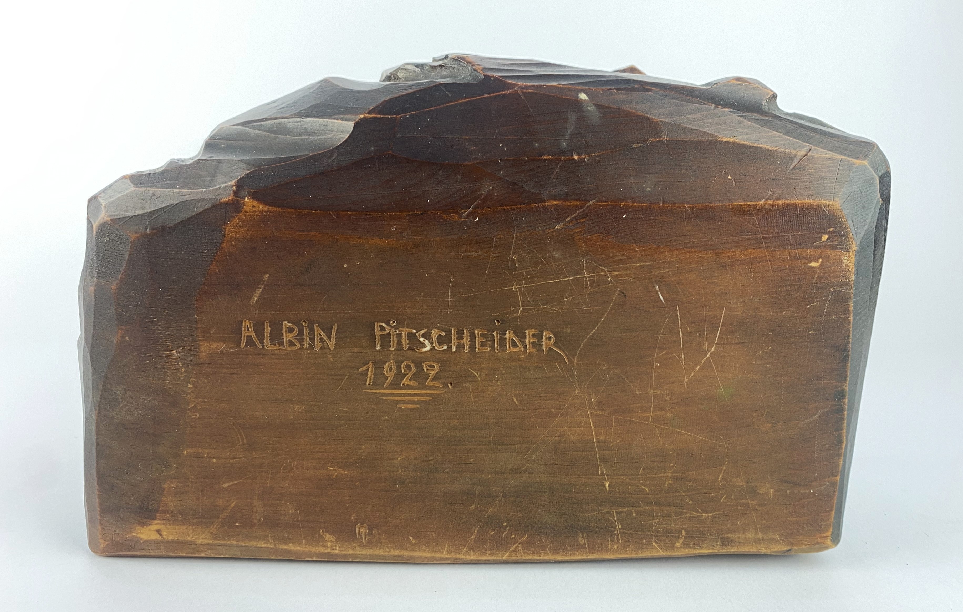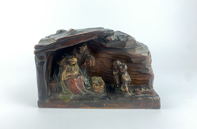 A Black Forest style carved Nativity scene, nativity figures to left with painted decoration, with two children and a toy car to right, inscribed to base '2gns', diameter 24.5cm