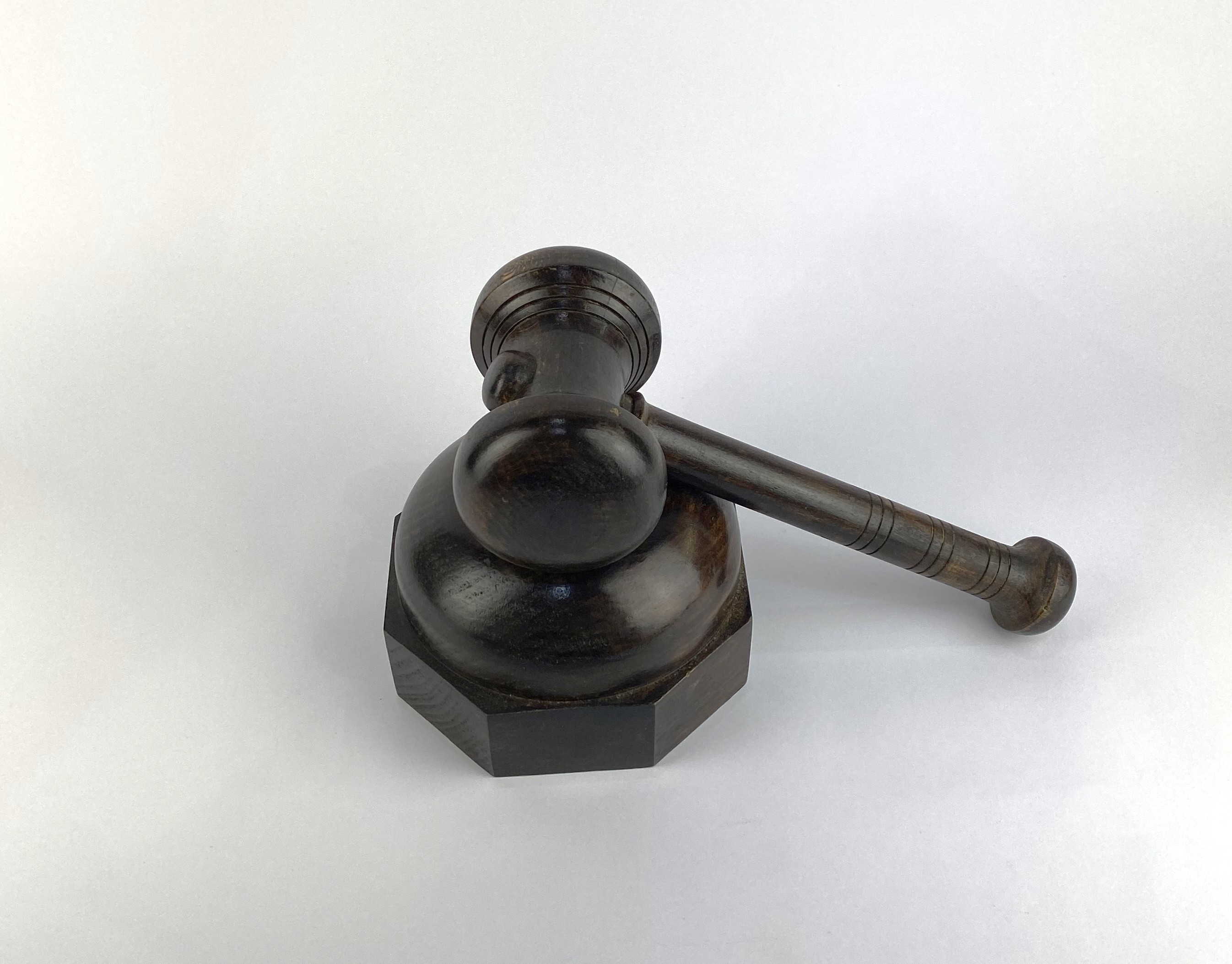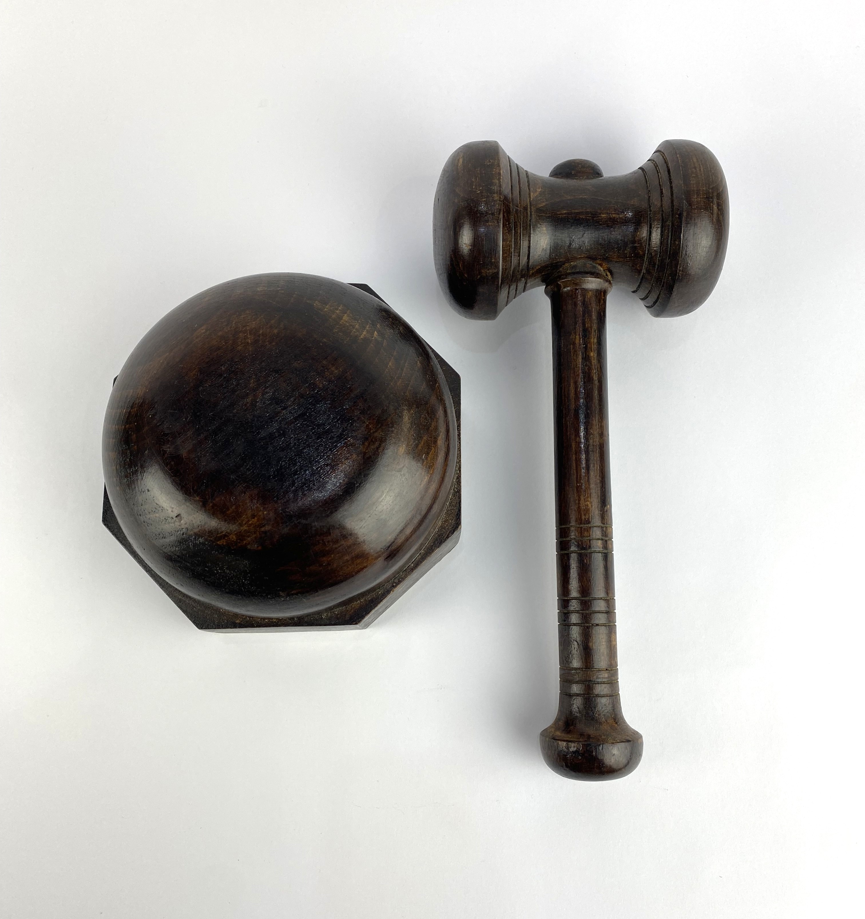 A large vintage novelty gavel and block, turned oak, block with octagonal base, gavel length 29.5cm (2)