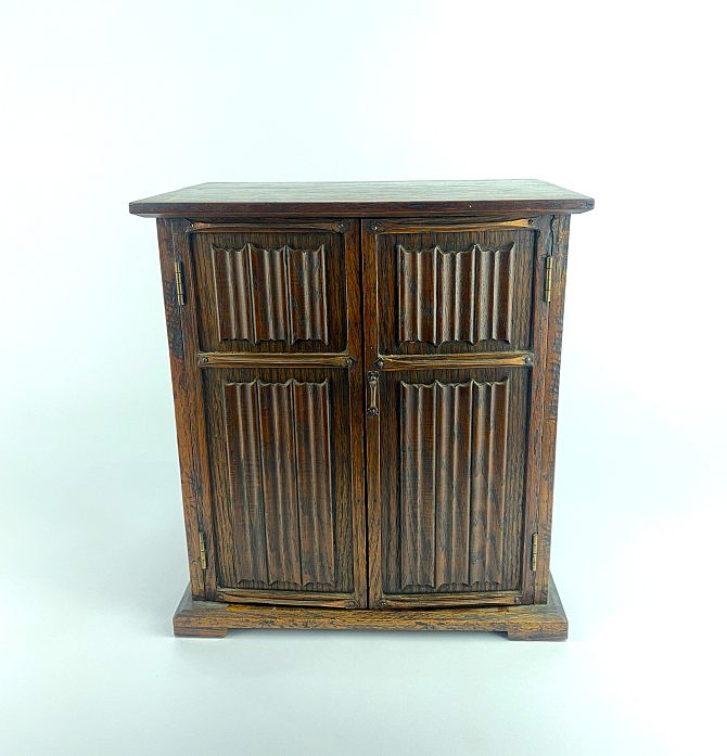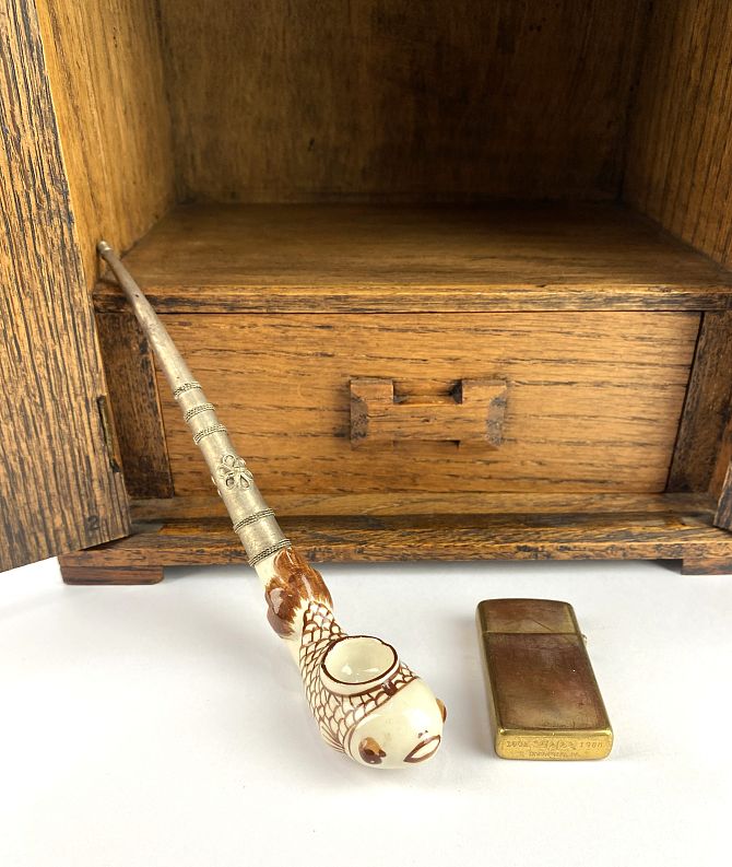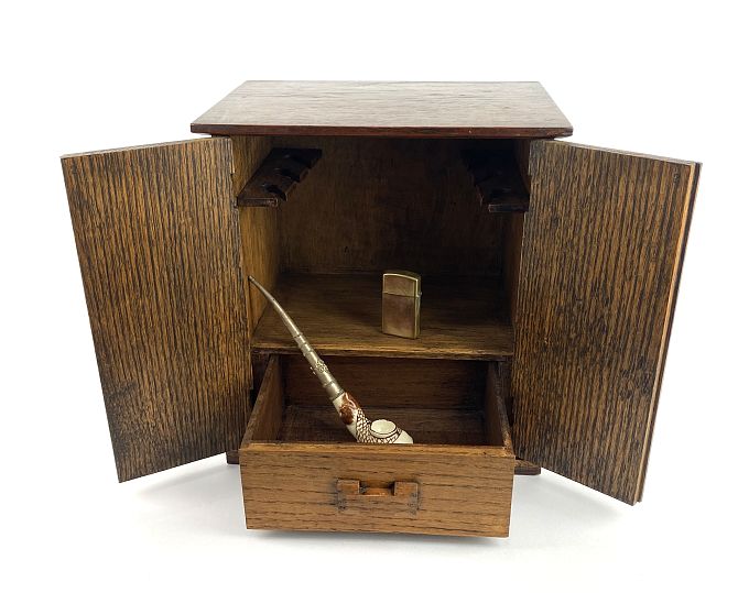 An Arts & Crafts style oak smokers cabinet, two doors opening to reveal single drawer, height 27.75cm, together with a brass Zippo lighter and a vintage fish form pipe (3)