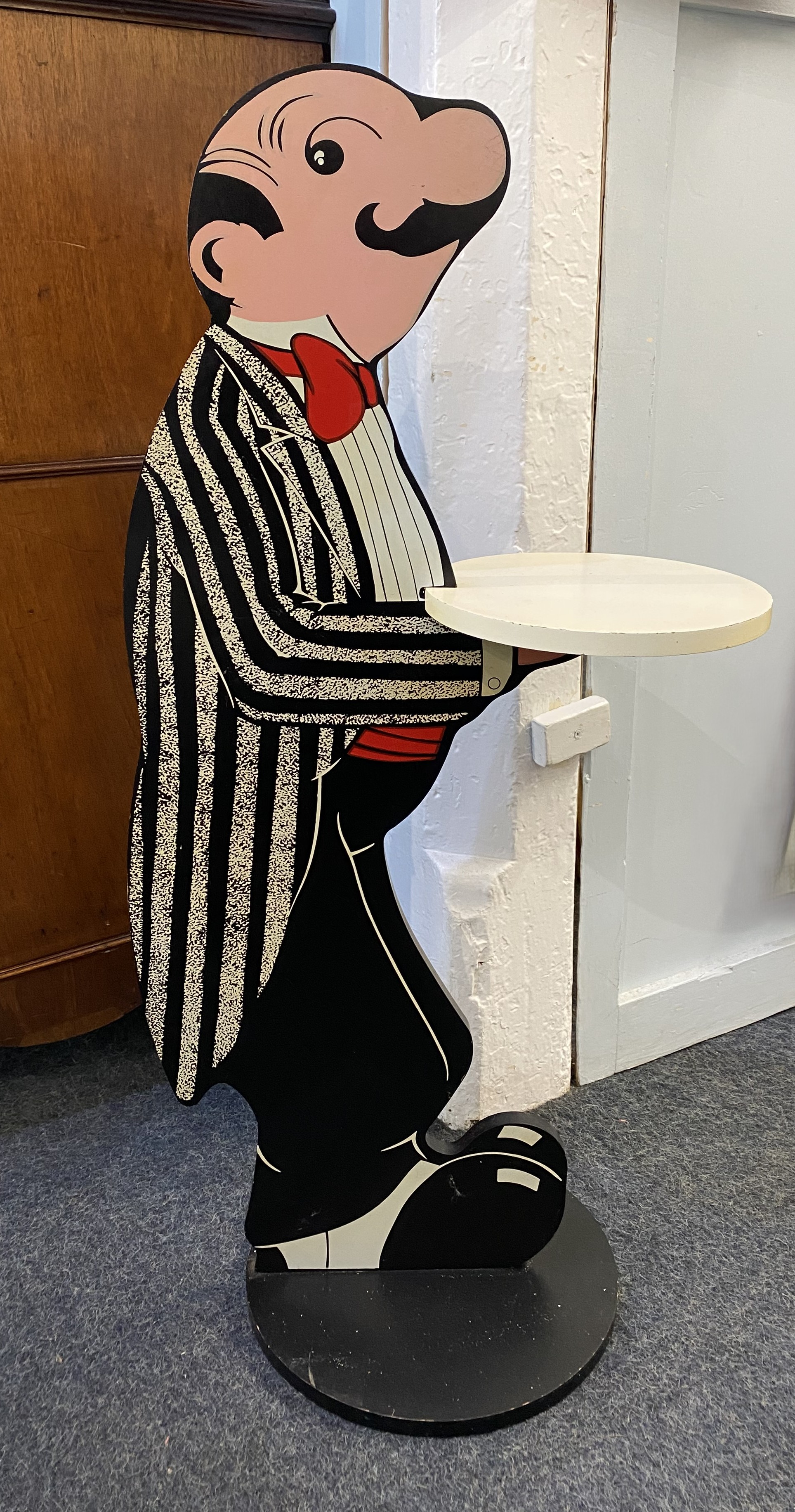 A dumb waiter, modern, modelled as a comical waiter holding a tray, 92cm high.