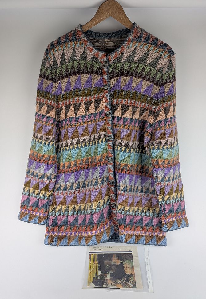 A Kaffe Fassett design knitted wool cardigan, with a newspaper cutting of Queen Elizabeth II wearing an almost identical design