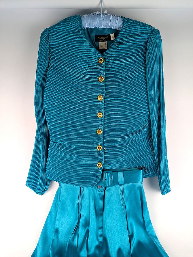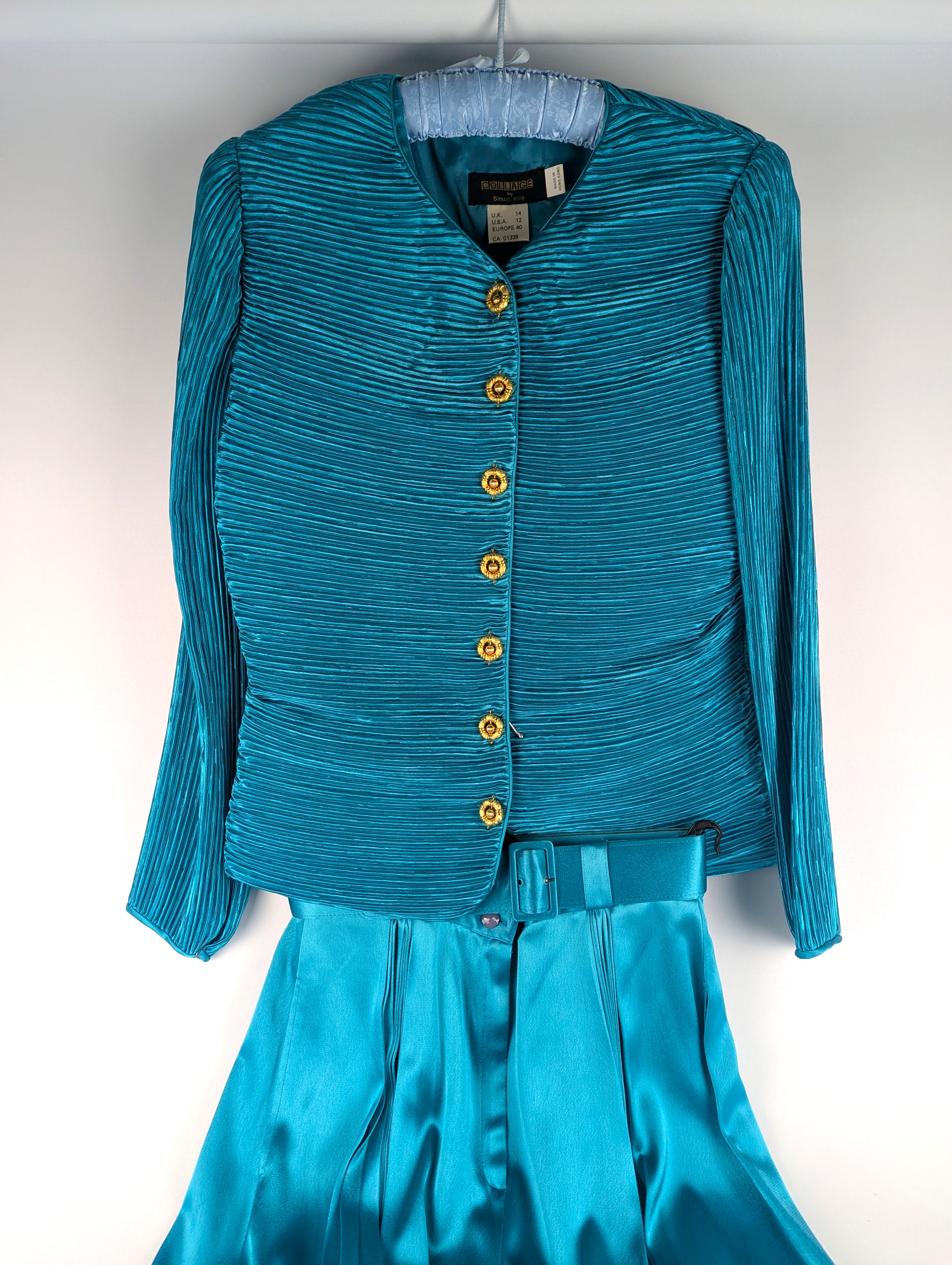 A vintage Collage by Simon Ellis turquoise pleated blazer, vest and culottes with matching belt, size 14