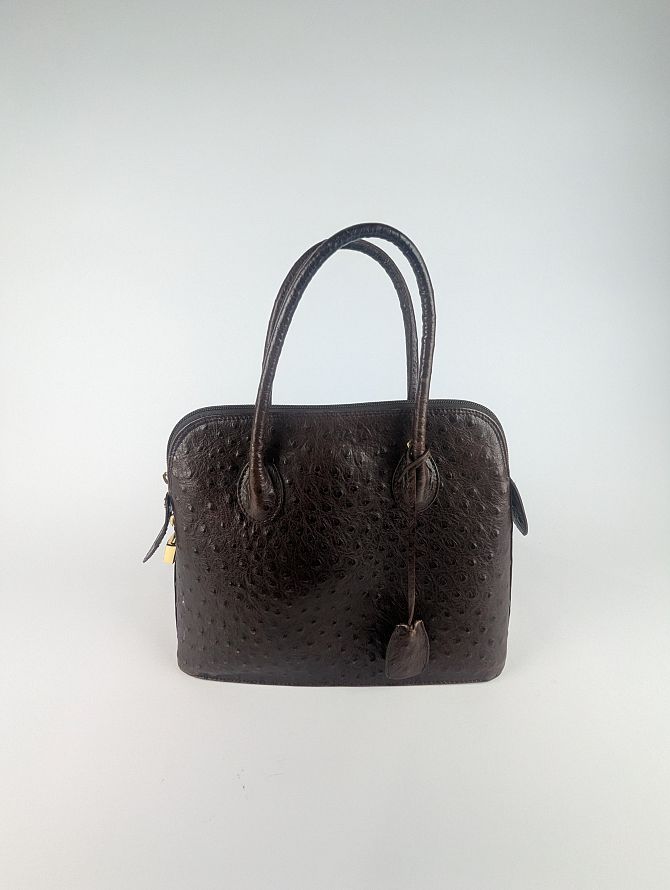 A vintage ostrich leather bag handbag by Carla Sade, in brown with gold tone hardware, leather clochette, lock with and key, logo lining, width 30cm