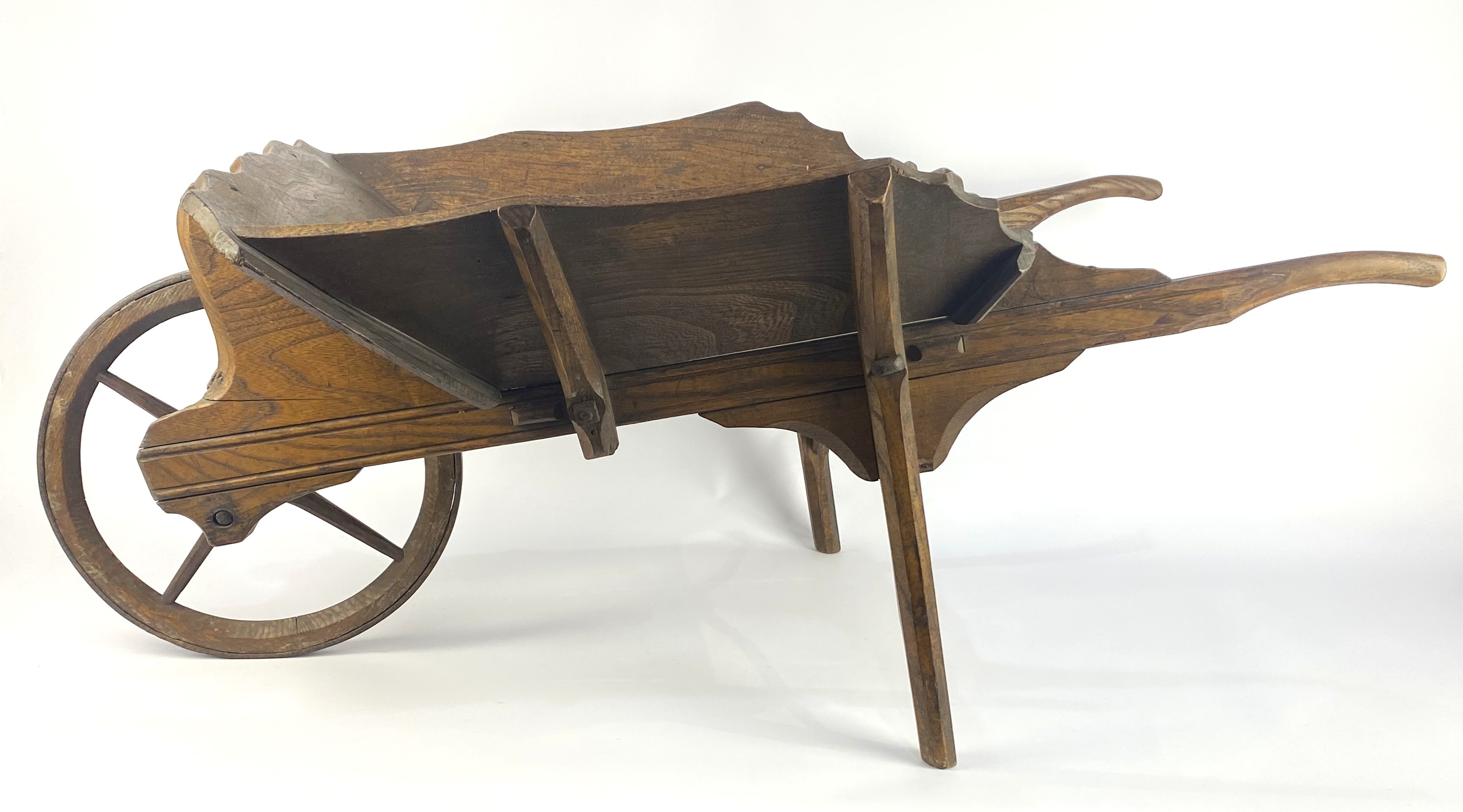 An antique wooden child's wheelbarrow with decorative scalloped edge, 86cm long