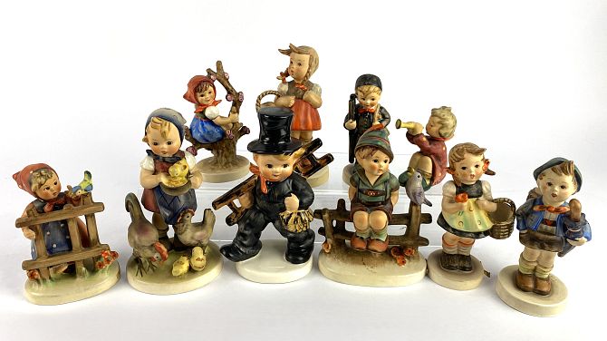 A collection of ten Goebel Hummel figures, including; Boy on Fence, The Chimney Sweep, small Chimney Sweep, Signs of Spring, Apple Tree Girl, Feeding Time, Sister, Home from the Market, girl with basket and Girl Playing, Horn, height 14cm (10)