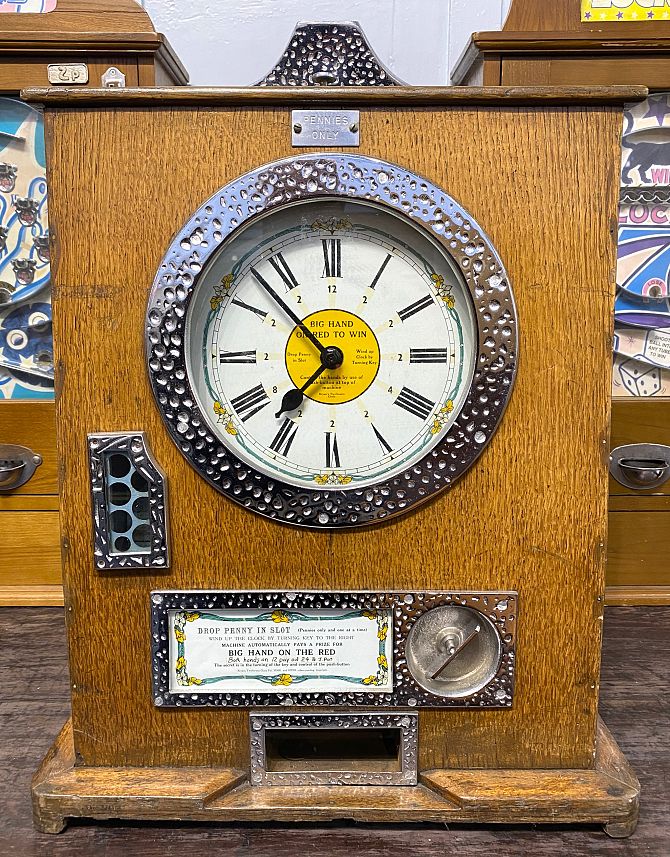A c.1930's / 50's Bryan's Twelvewin Clock 'Big Hand on Red' penny arcade machine, oak case with chromed mounts, key present, 66cm high