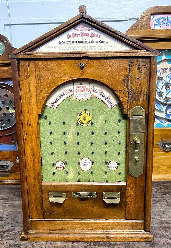 A Haydon & Urry Ltd 'Test Your Skill' arcade machine, successful winners receive a ticket to win a cigar, c.1897 - 1900, fruitwood cabinet with brass mounts, key present, 75cm high.