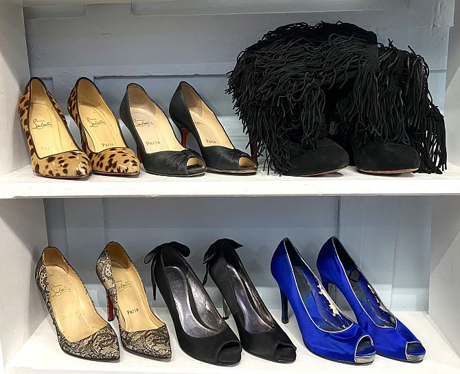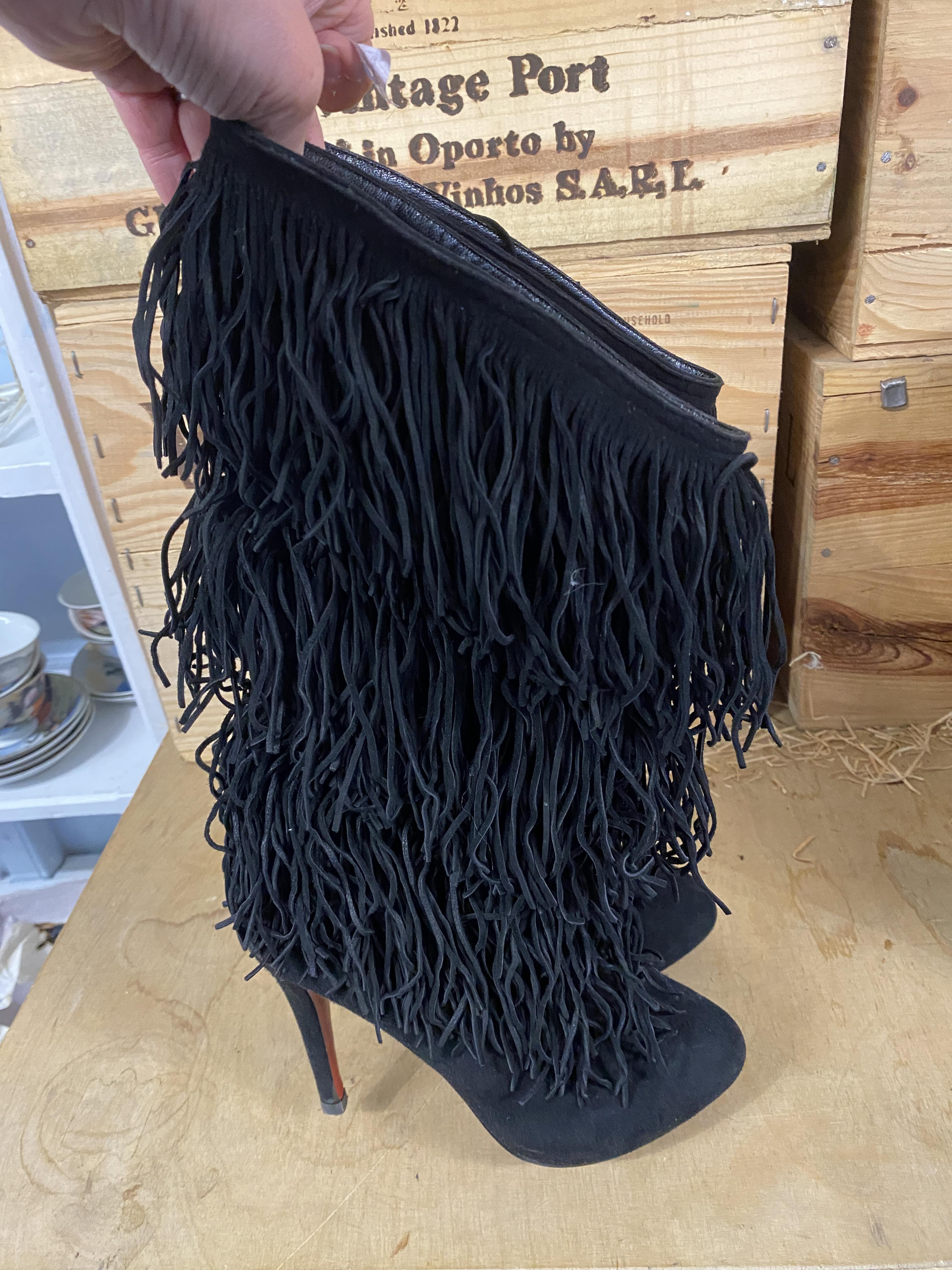 Four pairs of Christian Louboutin designer shoes comprising black suede fringed boots, black satin peep-toe heels, So Kate leopard print pony hair heels and Fifi black lace heels, all size 36, three with dust bags, together with a pair of Nine West heels, and a pair of Carvella heels (a/f)