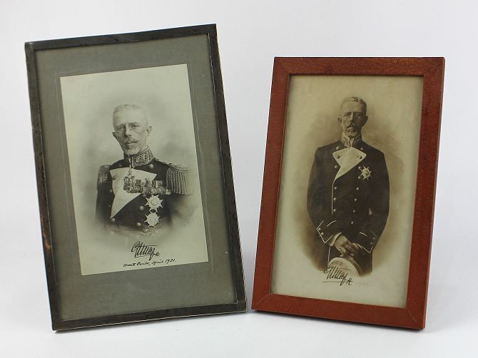 Royal Memorabilia: Two signed presentation photographs of Gustaf V of Sweden (1958 - 1950), including; a portrait signed in black ink and inscribed 'Monte Carlo, April 1921' within a silver phtoto photograph frame, by William Neale, Birmingham, 1912, overall 30.5cm x 20.5cm, together with a signed sepia photograph, inscribed with date 1923, within vintage brown leather 'Asprey, London' frame, overall 27cm x 18.2cm (2)