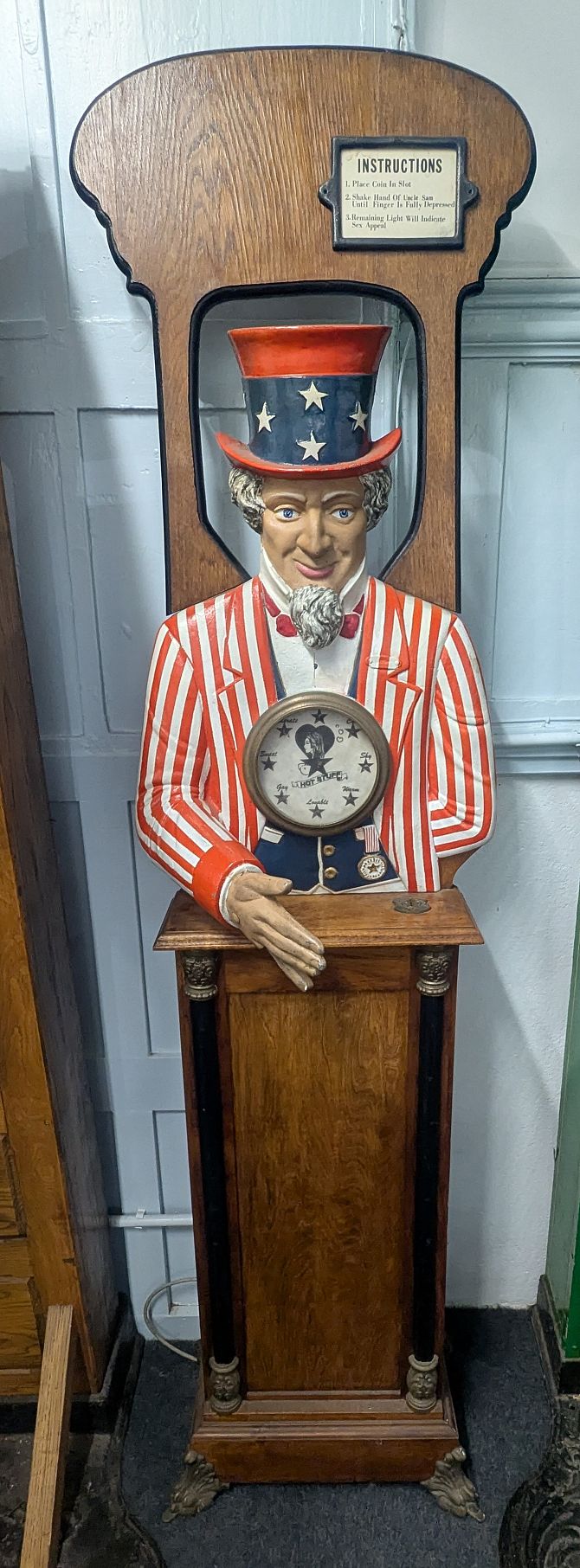 A vintage Uncle Sam 'Test Your Sex Appeal' arcade game, shake Uncle Sam's hand and find out if you're hot stuff, lovable, shy, or many other traits, the oak case with metal mounts and brightly painted decoration and graphics, with instruction panel, cast brass coin slot, architectural column decoration and ornate cast gilt metal feet, 198cm high.
