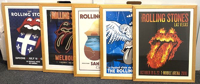 The Rolling Stones: a collection of five tour posters prints, one limited edition, Petro Park, San Diego, May 24, 2015, numbered 57/350; Rod Laver Arena, 5 November; July 15, Quebec (two designs); T-Mobile Arena Las Vegas, October 19 & 22 2016; each framed, within frame 44.5cm x 59.5cm