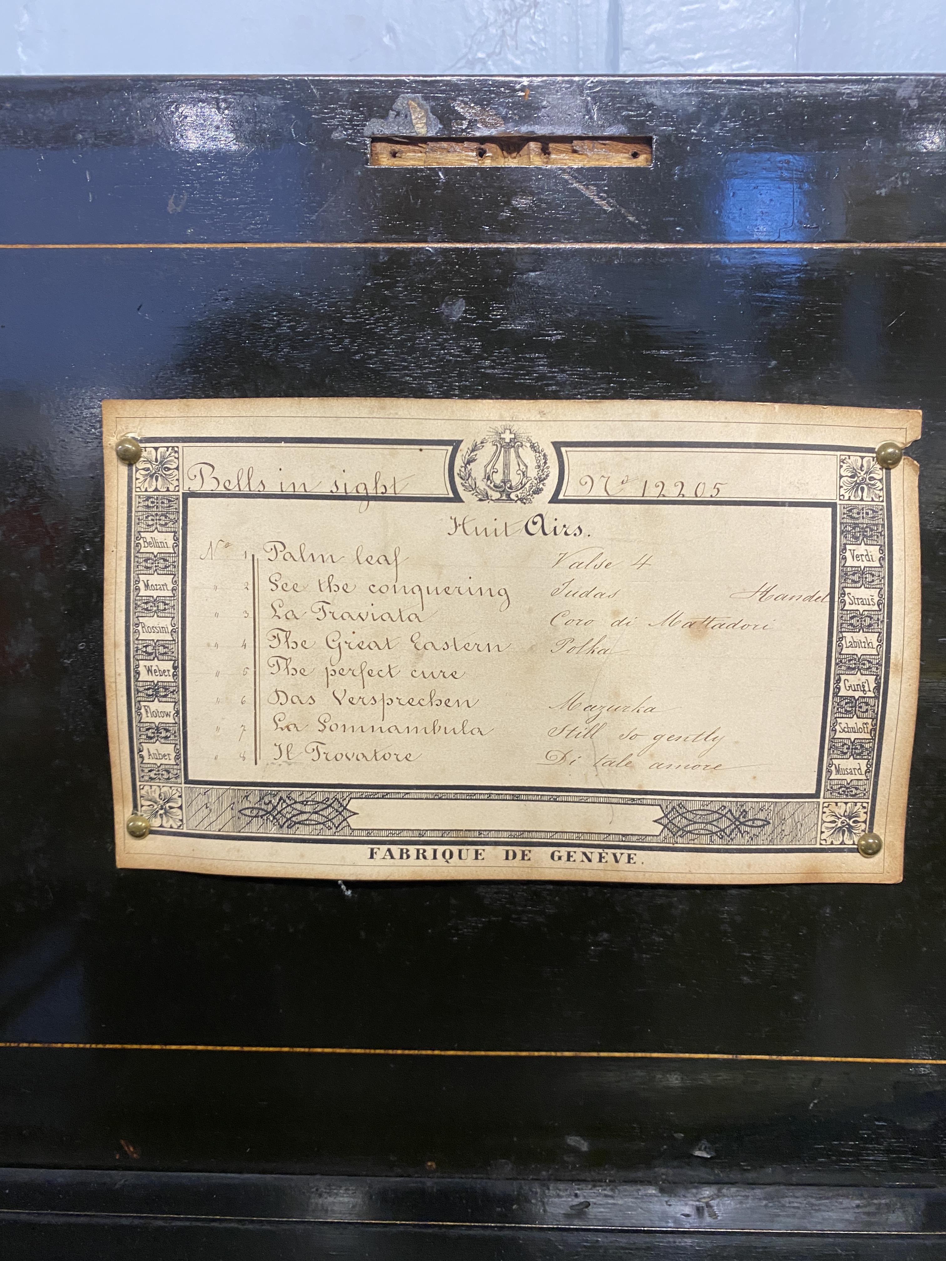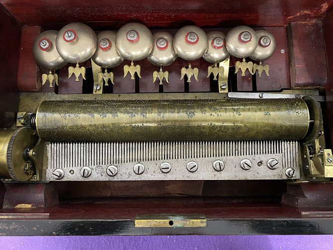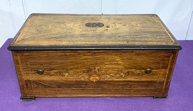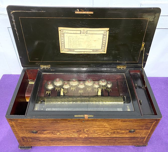 A 19th century Swiss cylinder music box, the inlaid rosewood case, hinged lid opening to reveal original tune card, the brass cylinder movement playing 8 airs, single steel comb, with nine bells with dove detail, numbered 12205, width 59cm, the comb width approximately 31.5cm