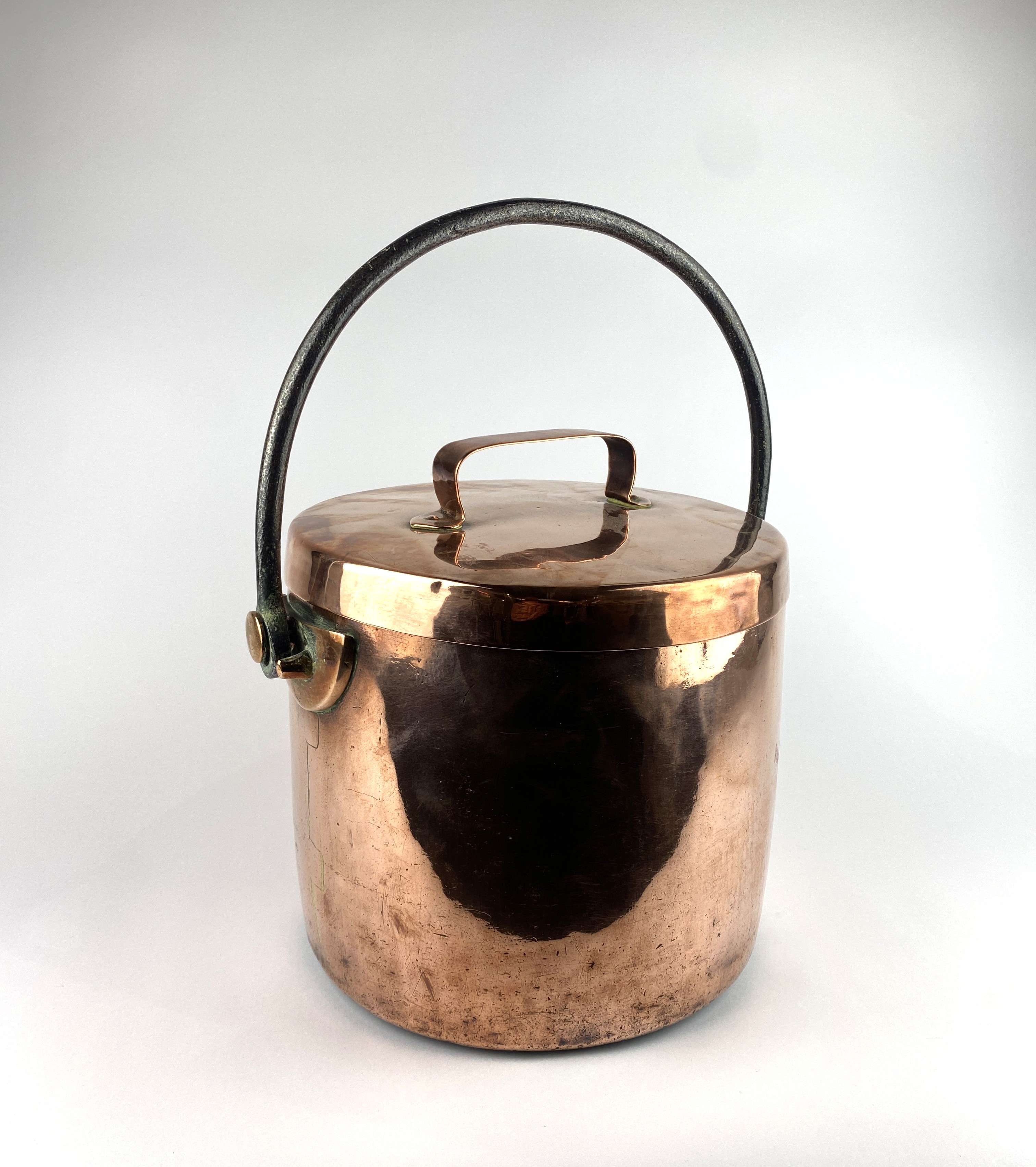 A 19th century copper cooking pot and lid, with cast iron swing handle, 30cm high (not including handle).