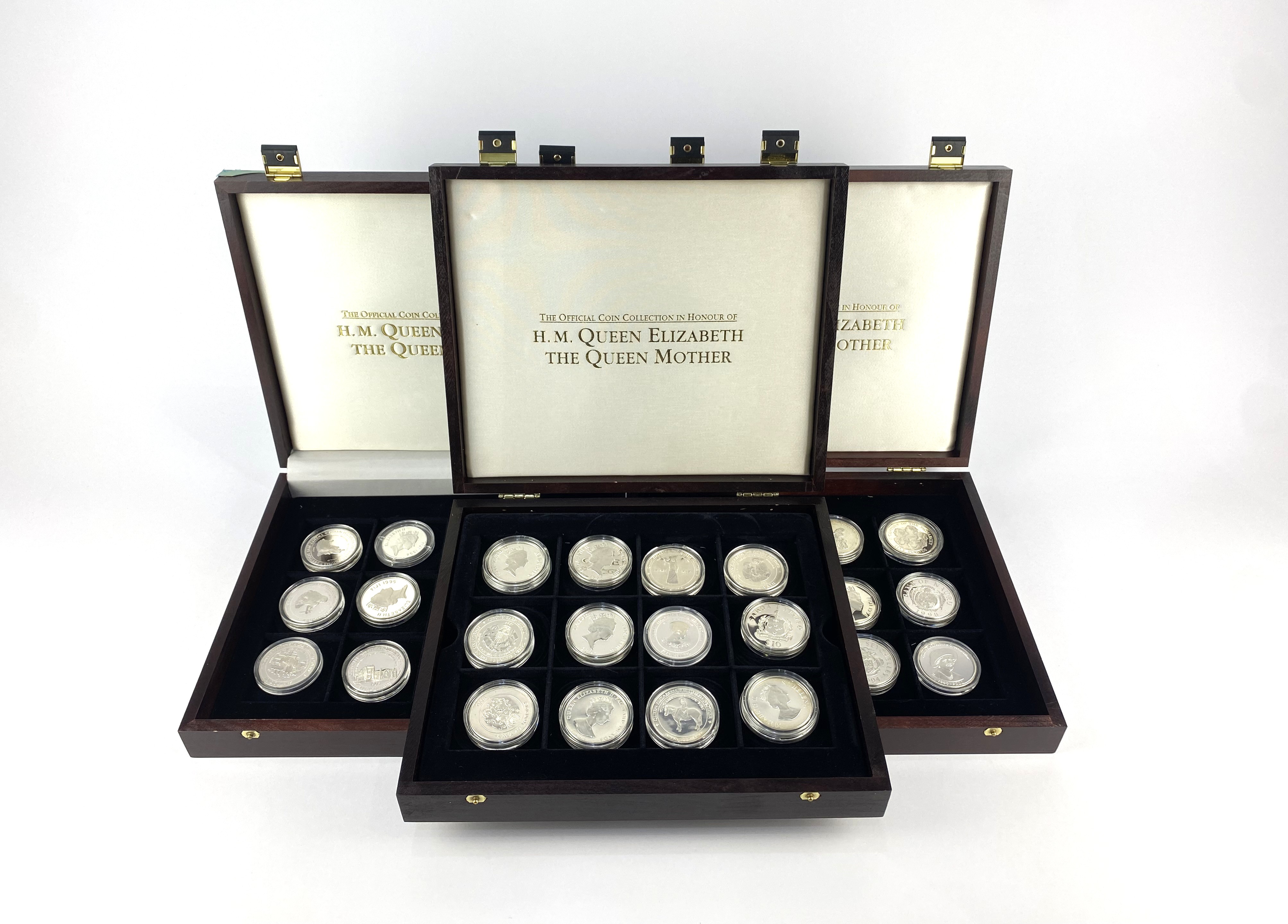 Forty-seven silver proof crown size comemmorative coins and a Barbados proof silver One Dollar with three display boxes detailed HM Queen Mother, note varying individual weights