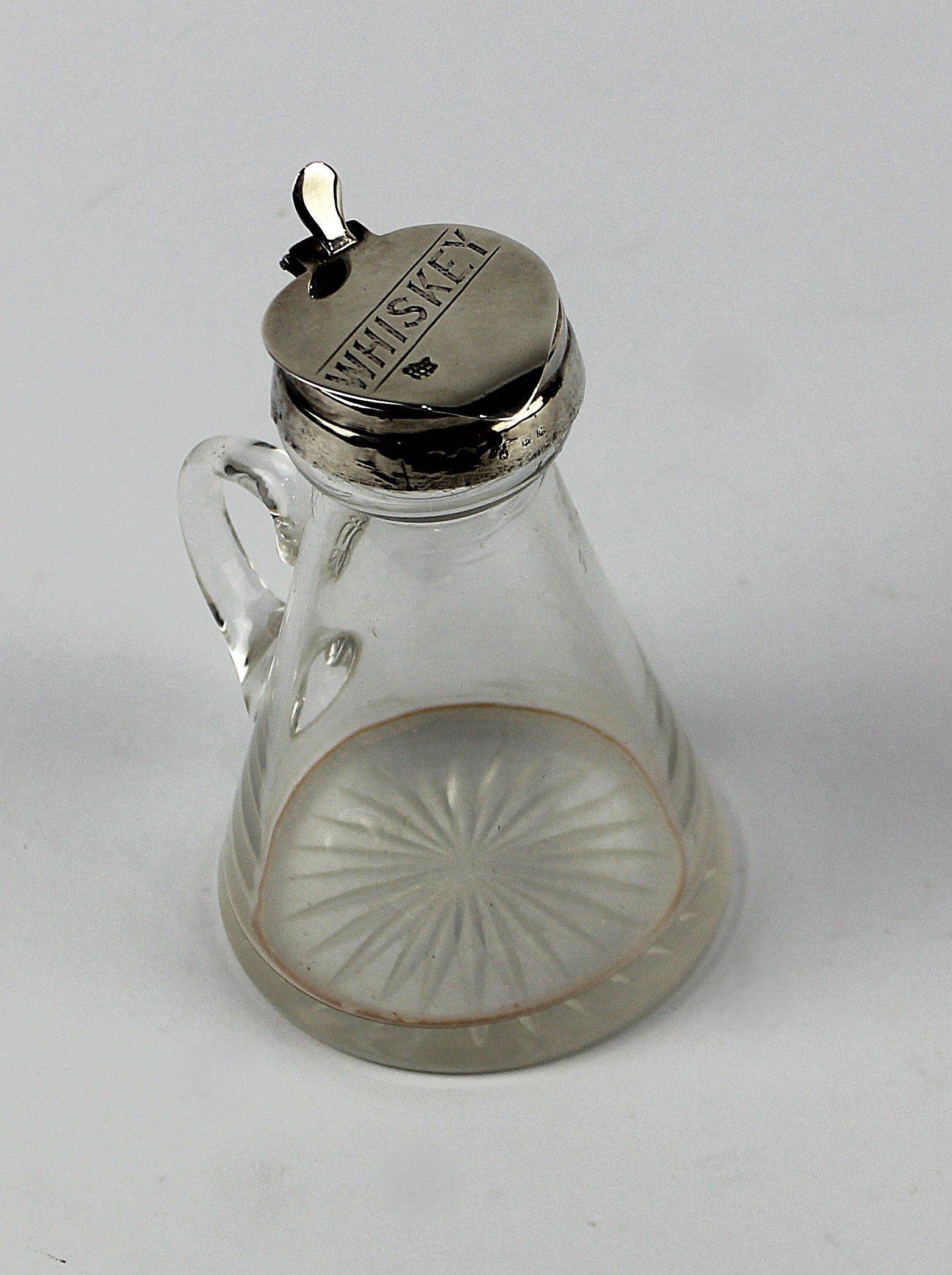 An Edwardian silver mounted cut glass whisky noggin, by J. H. Worral Son & Co. Ltd, town mark rubbed, the silver lid engraved 'Whiskey', (silver mount AF) height 10.5cm
