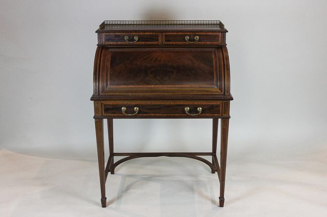 An Edwardian mahogany and satin wood banded small cylinder fall desk with gilt gallery above two small drawers and opening 'cylinder' top enclosing fitted interior and pull out slide with one long drawer below on square tapered legs, 78cm