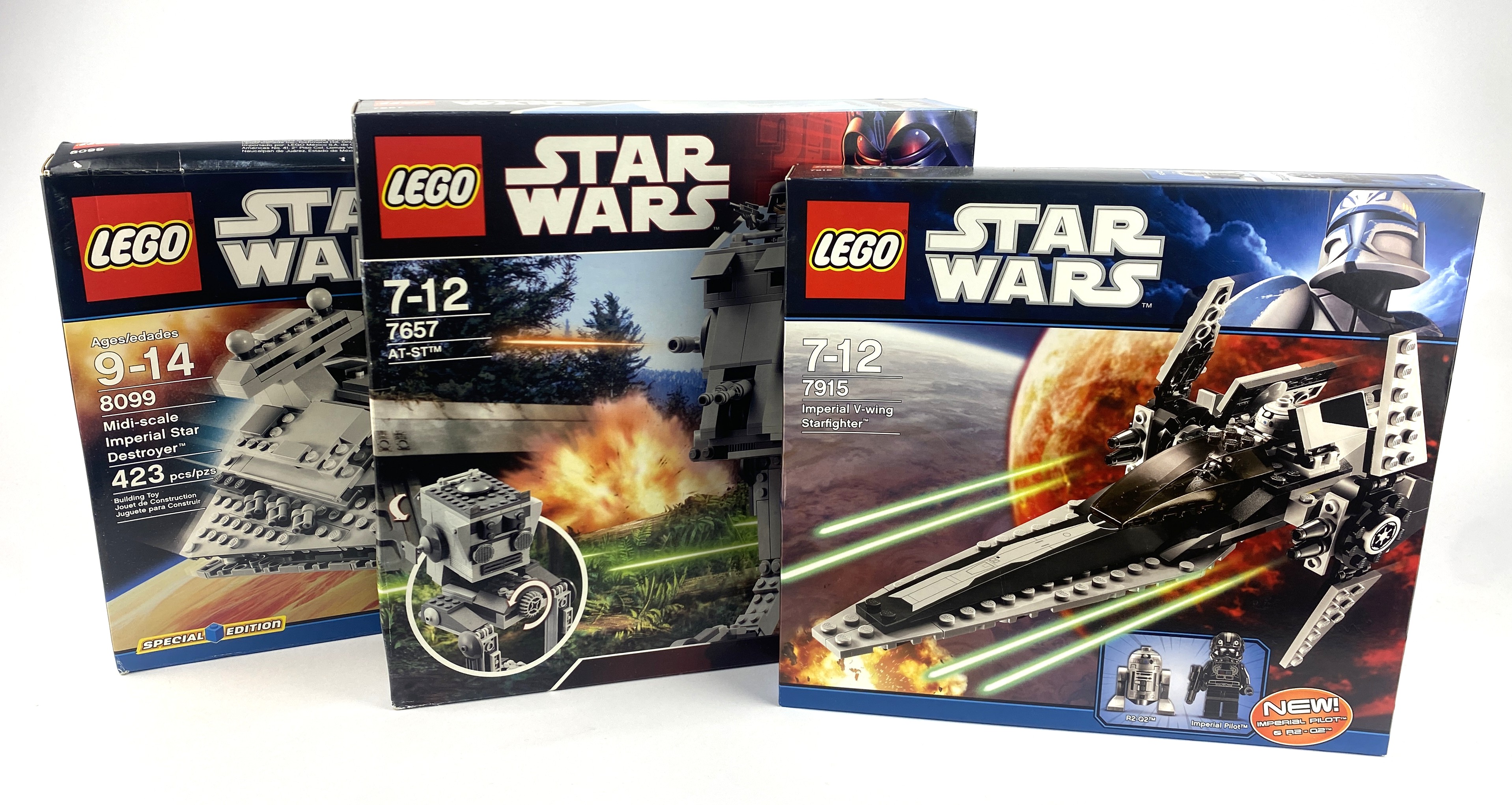 Three boxed Lego Star Wars sets comprising 7915 Imperial V-wing Starfighter, 7657 AT-ST and 8099 Midi-scale Imperial Star Destroyer