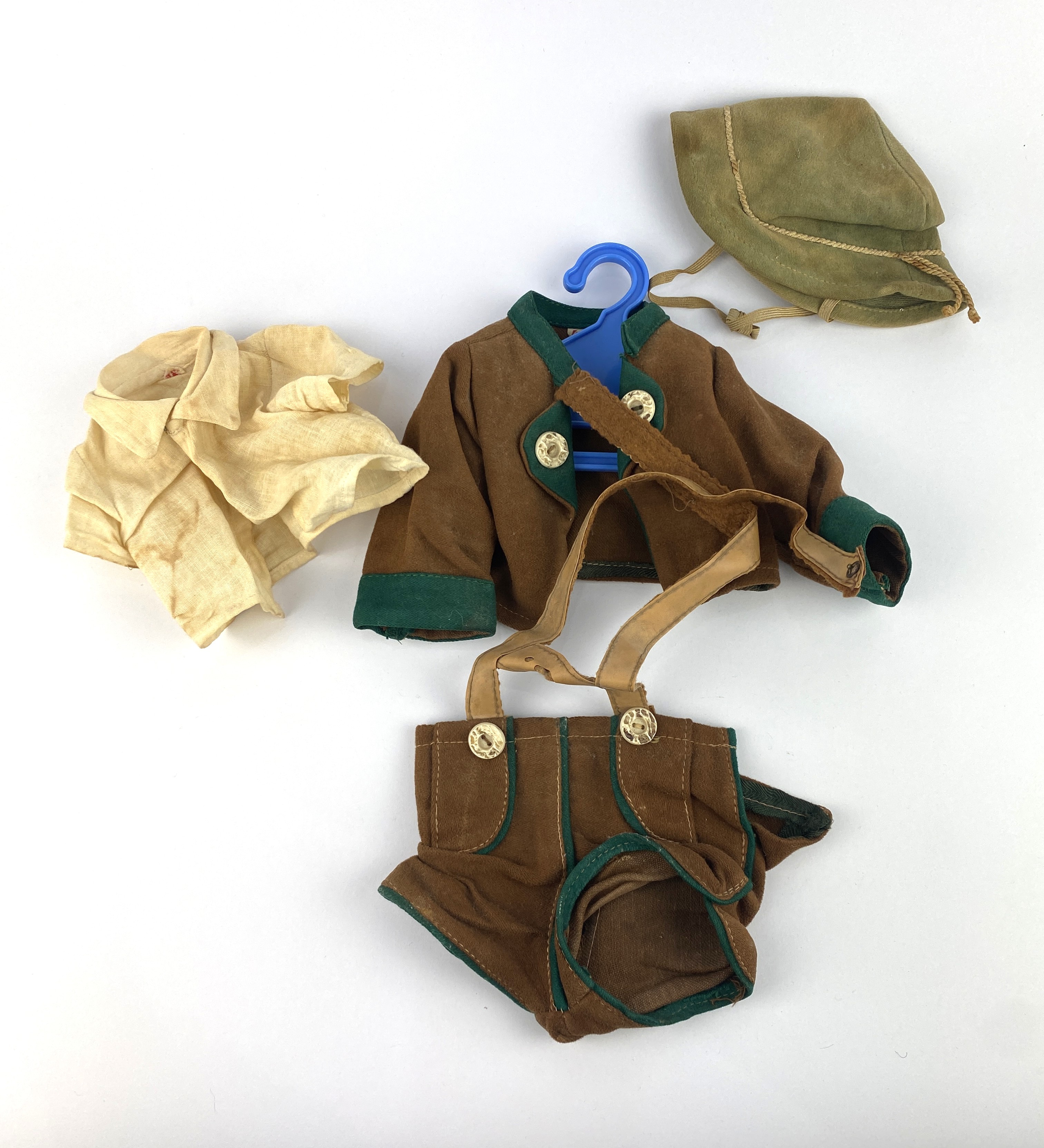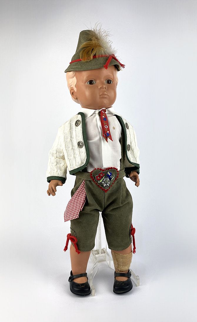 A vintage Schildkrot Bavarian boy doll with glass eyes, 45cm high with two outfits, one original (a/f)