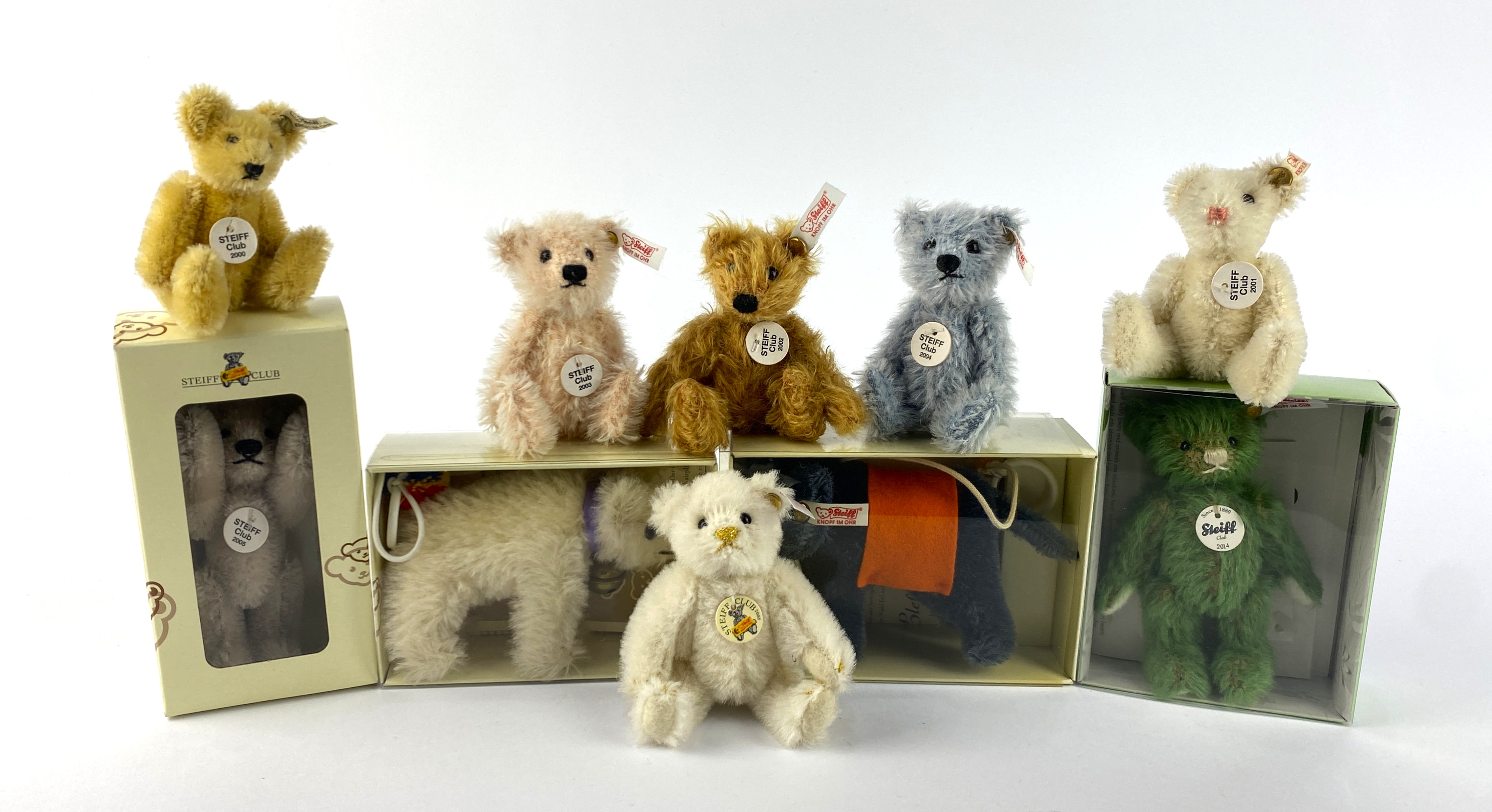 Ten Steiff Club Gift miniature teddy bears and animals comprising 2000, 2001, 2002, 2003, 2004, 2005 (boxed), polar bear 2006 (boxed), elephant 2007 (boxed), 2008 and 2014 (boxed)