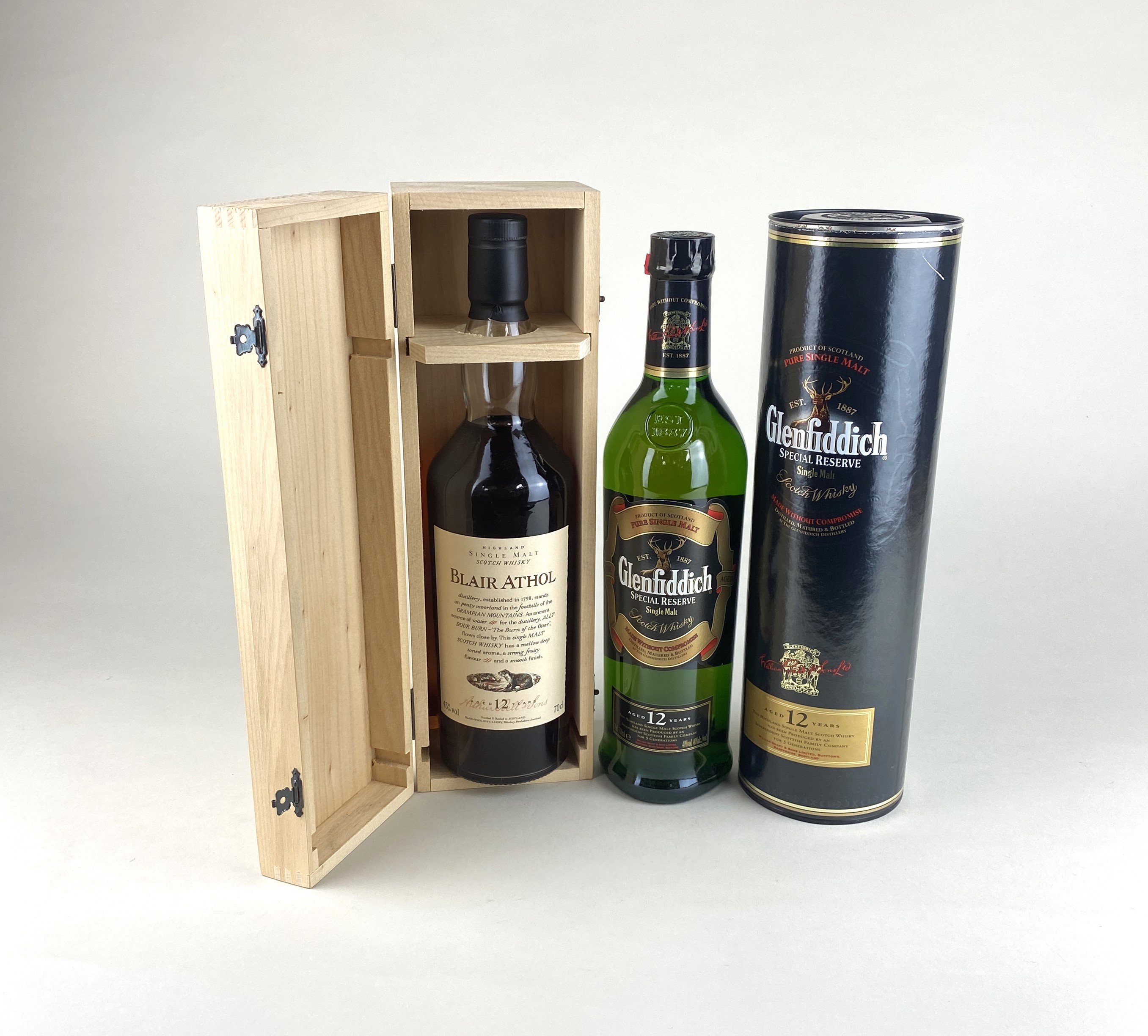 Whisky: Blair Athol Highland Single Malt Scotch Whisky aged 12 years, with original presentation wooden case, 43%, 70cl, level at low neck, single bottle. Together with a single bottle of Glenfiddich Special Reserve Single Malt Scotch Whisky, Aged 12 Years, 40%, 70ml, level at low neck, with original presentation case, (2).