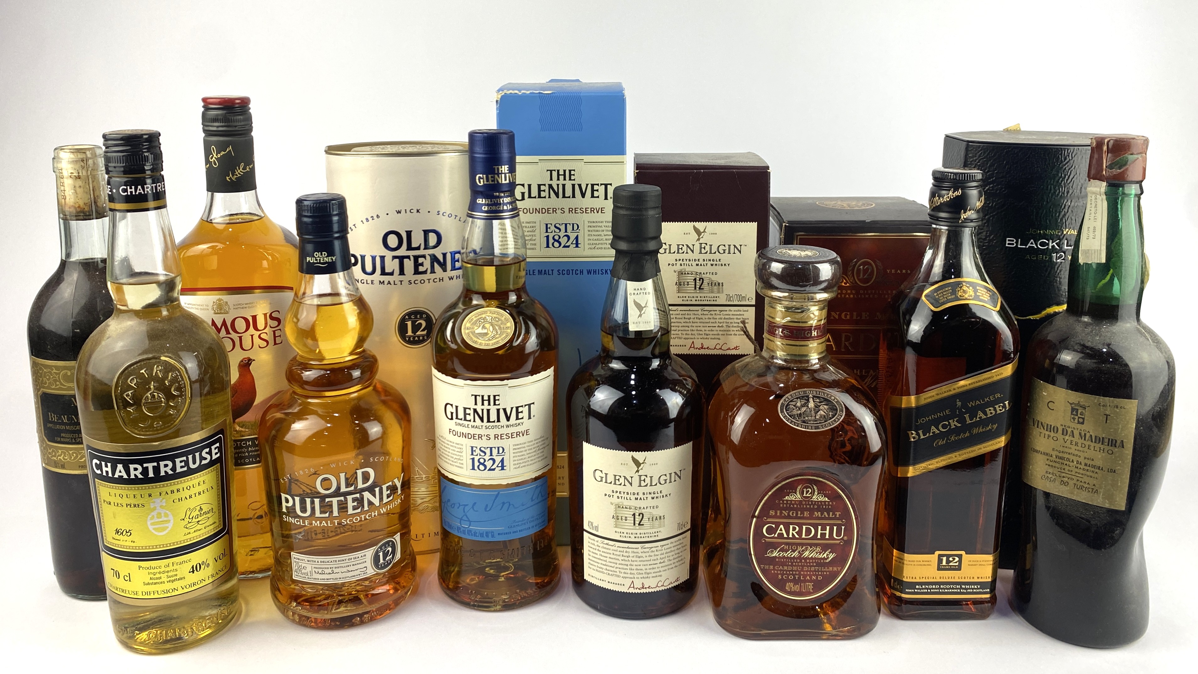 Whisky: A collection of nine bottles of whisky and liqueurs, including; Glen Elgin Speyside Single Pot Still Malt Whisky, Aged 12 Years, within box, 70cl; Cardhu Distillery Single Malt, Aged 12 years, within card box, 1 litre; The Glenlivet Founder's Reserve Single Malt Scotch Whisky, within box, 70cl; Old Pulteney Single Malt Scotch Whisky Aged 12 Years, within box, 70cl; Famous Grouse Scotch Whisky, 1 litre; Johnnie Walker Black Label 12 Years, within tin, 70cl, together with Chartreuse Liqueur, L. Garnier 70cl; Vinho d Madeira Tipo Verdelho 70cl and 1987 Muscat de Beaumes de Venise, 75cl (9)