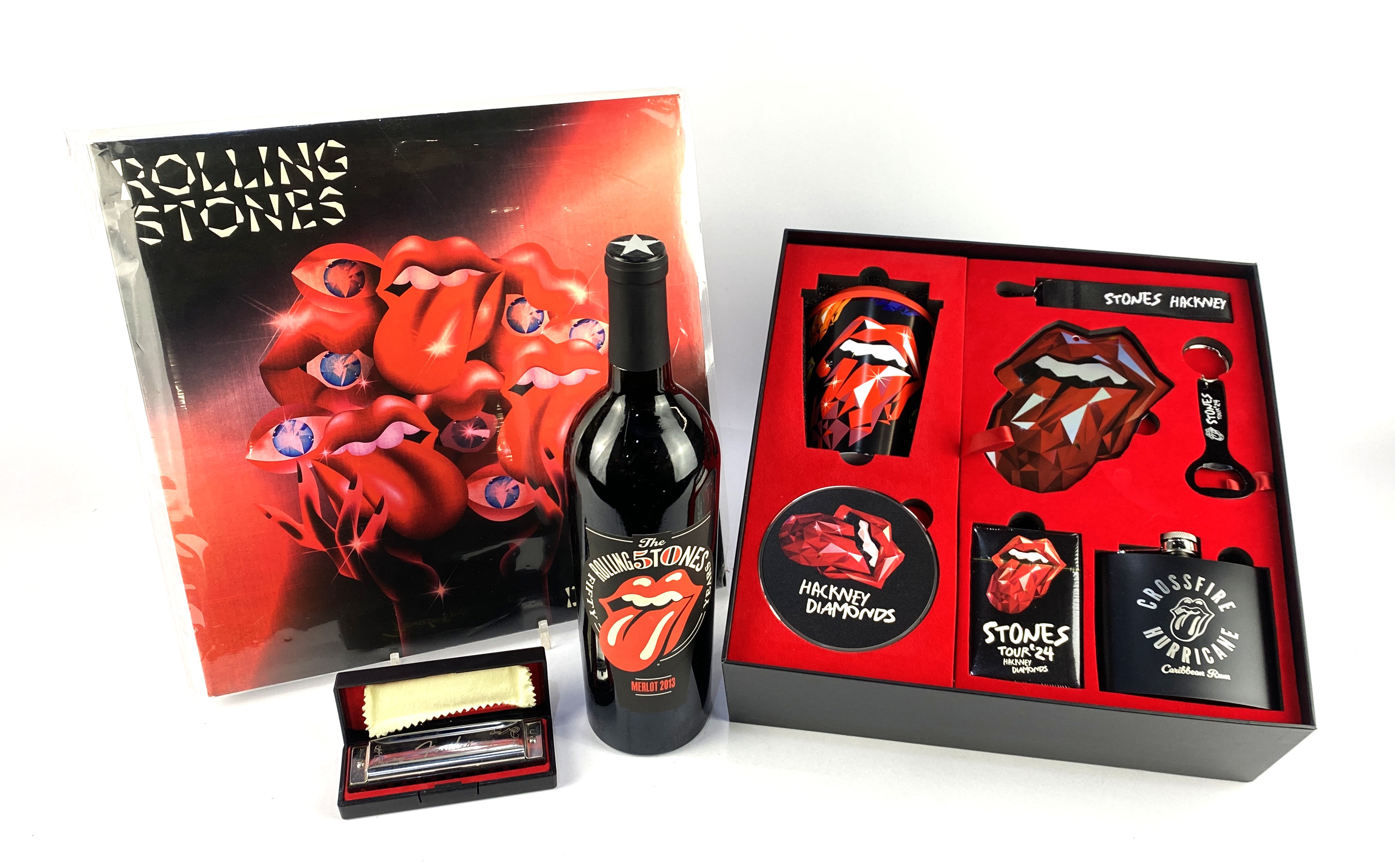 The Rolling Stones: A 2013 bottle of 50th Anniversary Merlot, together with a 'Stones Tour '24' Hackney Diamonds boxed set containing travel cup, bottle opener, hip flask, phone charger, strap, and playing cards, with retailers bag, blue vinyl copy of 'Hackney Diamonds' 554 645-9, with sleeve and inserts, and a boxed Fender mouth organ (qty)