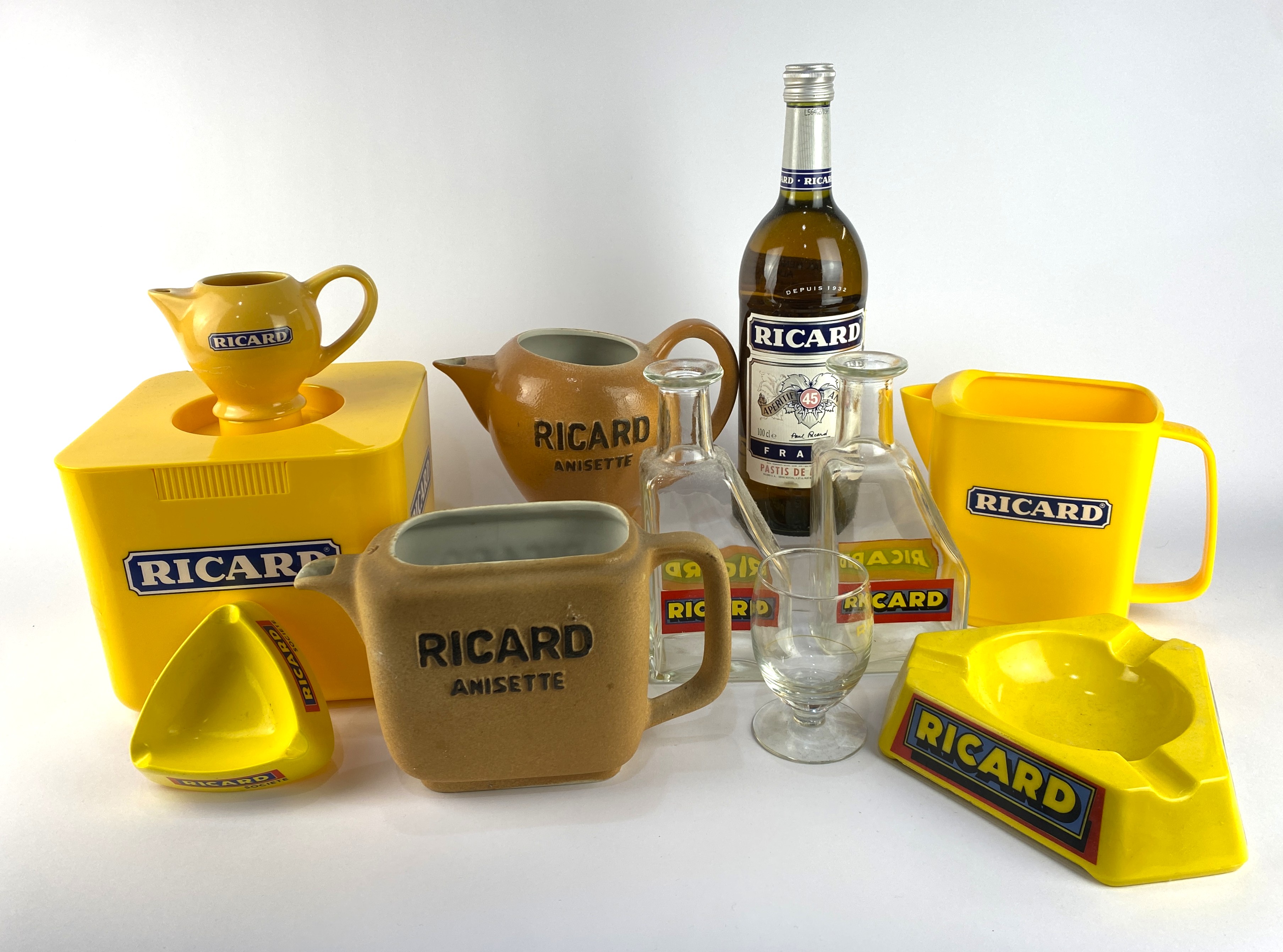 Liqueurs and spirits: a 100cl bottle of Ricard pastis, together with a collection of Ricard branded items comprising two glass bottles (missing stoppers), a glass, a plastic Ricard ice bucket and jug, two Ricard ashtrays and three Ricard ceramic jugs