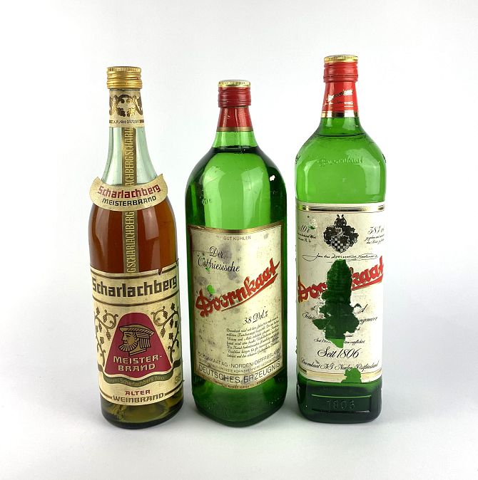 Liqueurs & Spirits: Three vintage bottles of schnapps, including; two 1 litre bottles of German Doornkaat 38% (one label AF) together with a 70cl bottle of Scharlachberg Meisterbrand 38% (3)