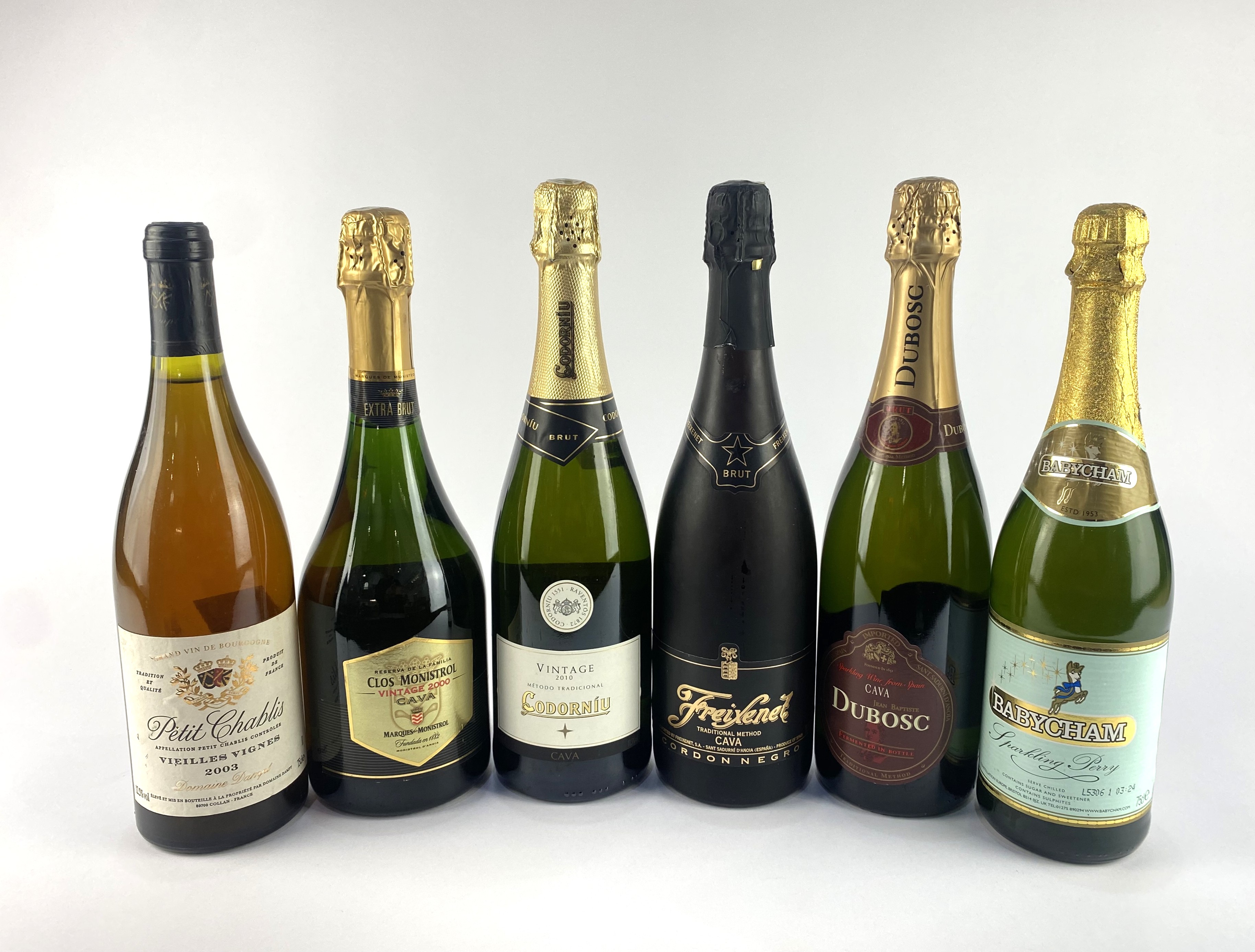 Wine: A mixed collection of six vintage bottles of white wine, including; 2003 Domaine Dampt Petit Chablis Vielles Vignes, 2010 Cordorniu Cava, 2000 Marques-Monistrol Clos Monistrol Cava, two further bottles of Cava and a bottle of Babycham (6)