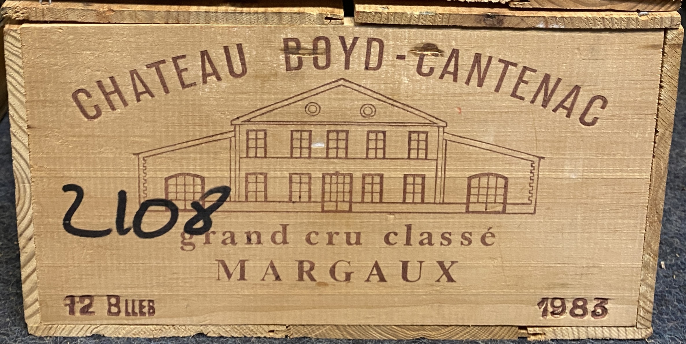 Wine: 12 bottles of Chateau Boyd-Cantenac grand cru classe Margaux, 1983, with original wooden case.