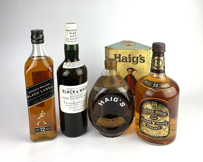 Whisky: A collection of four bottles of Scotch whisky, including; vintage Buchanan's Choice Old Scotch Whisky 'Black & White', by appointment to Het Majesty The Queen, 70o Proof; vintage Haig's 'Dimple Scots' Scotch Whiskey, by appointment to Her Majesty the Queen, 70o proof, in original card box; Johnnie Walker 'Black Label Blended Scotch Whisky, Aged 12 Years, 70cl and vintage Chivas Regal Blended Scotch Whisky, 86o Proof, 1.14 litres (4)