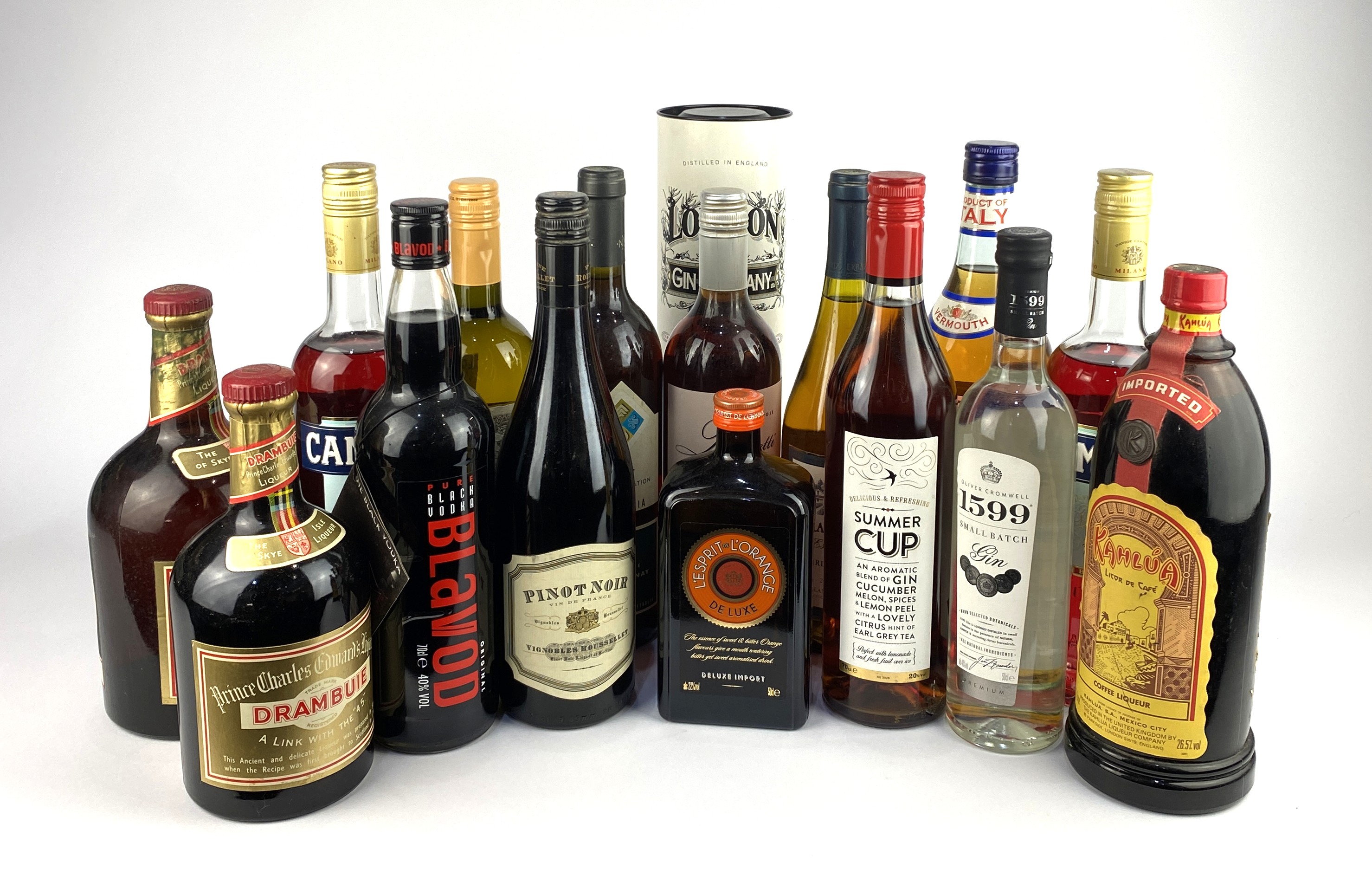 Spirits, Liqueurs & Wine: A collection of sixteen bottles, including; two vintage bottles of Drambuie, Prince Charles Edward's Liqueur, 70o Proof, 23 3/4 Fl Oz and one larger; two Campari, 70cl; Kahlua, 1 litre; London Gin Company, 1 litre in tube; Oliver Cromwell 1599 Small Batch Gin, 50cl; Blavod black vodka, 70cl; Vinelli Vermouth Bianco, 1 litre; L'Esprit de l'Orange de Luxe, 50cl; Summer Cup, 70cl; Vignobles Roussellet Pinot Noir, 75cl; Errazuriz Estate 2001 Chardonnay, 75cl; Castellore Pecorino 75cl; and two further bottles of wine (16)
