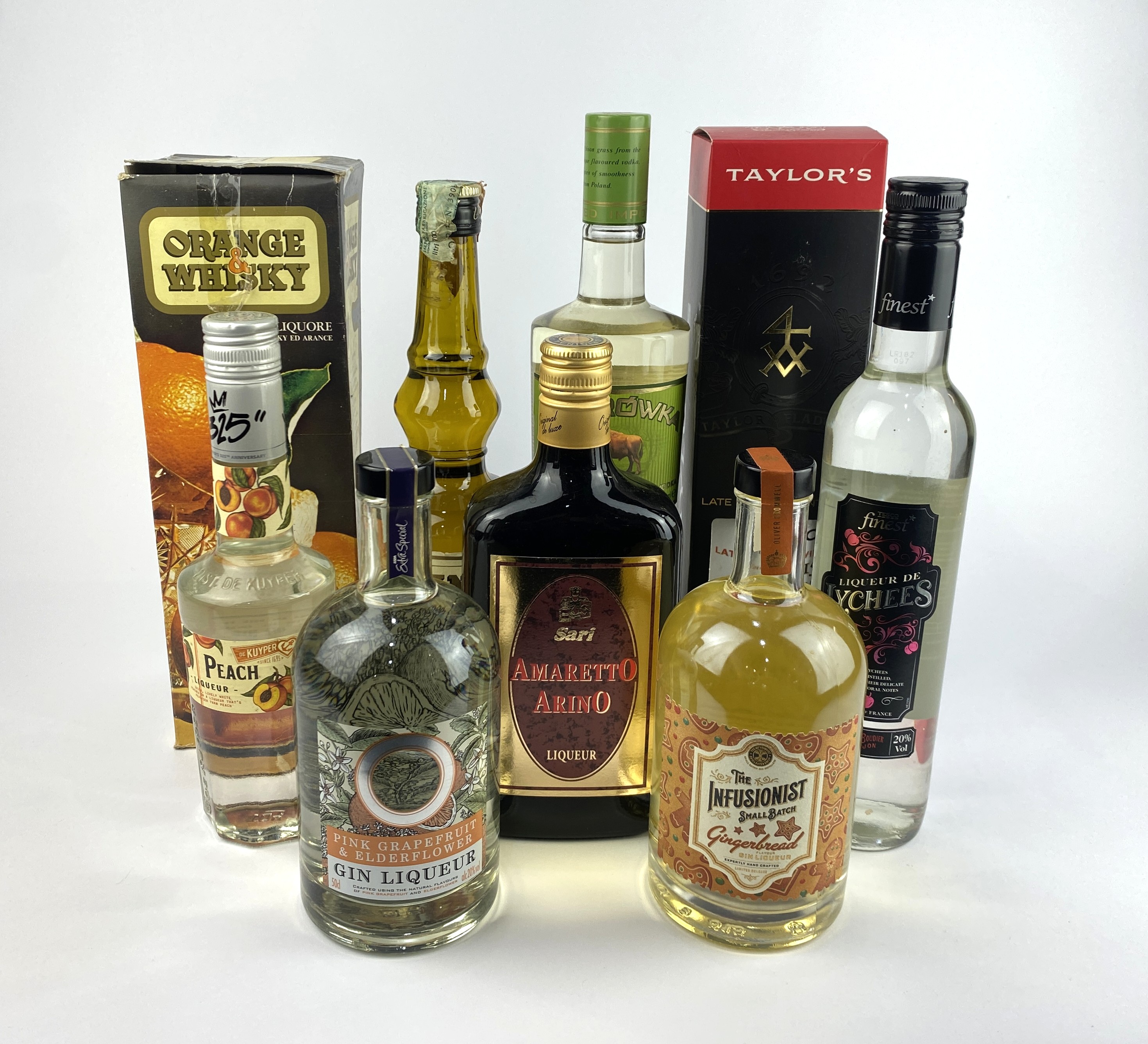 Liqueurs & Spirits: A collection of eight bottles, including; 2015 Taylor's Late Bottled Vintage Port, 75cl; Lychee Liqueur 50cl; Pink Grapefruit & Elderflower Gin Liqueur, 50cl, Zubrowka Bison Grass Vodka, 700ml; Gingerbread Gin Liqueur, 50cl, Peach Liqueur, 35cl; Amaretto Arino, 70cl and Orange & Whisky Liquore Di San Marino, 70cl (8)