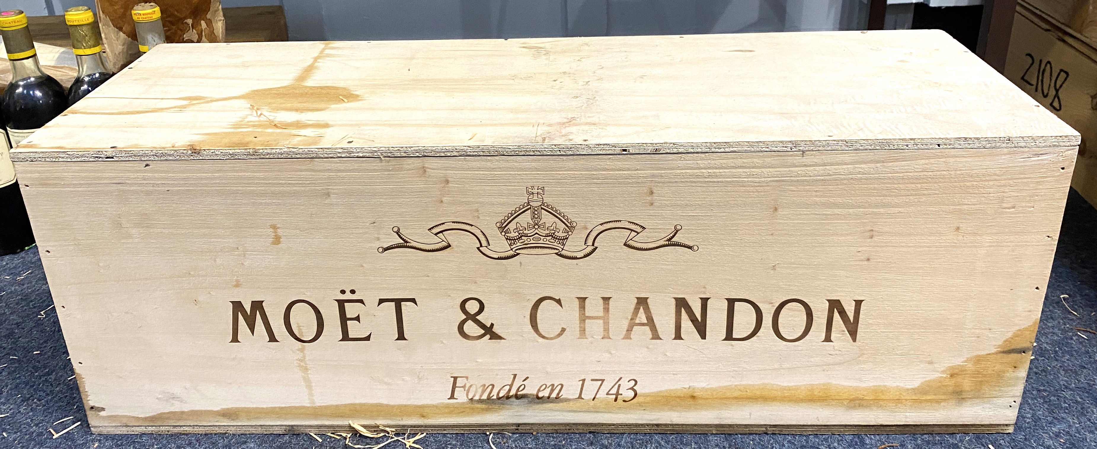 Champagne: a single Nebuchadezzar size bottle of Moet & Chandon Champagne, in original wooden case, case sealed, year unknown, case 84cm long, (this bottle was named after Nebuchadnezzar, the greatest king of Babylon, with 15L per bottle and equivalent to 20 standard bottles, the Nebuchadnezzar is the largest mainstream Champagne bottle available and is great for big meals or statements parties and can serve 120 flutes.