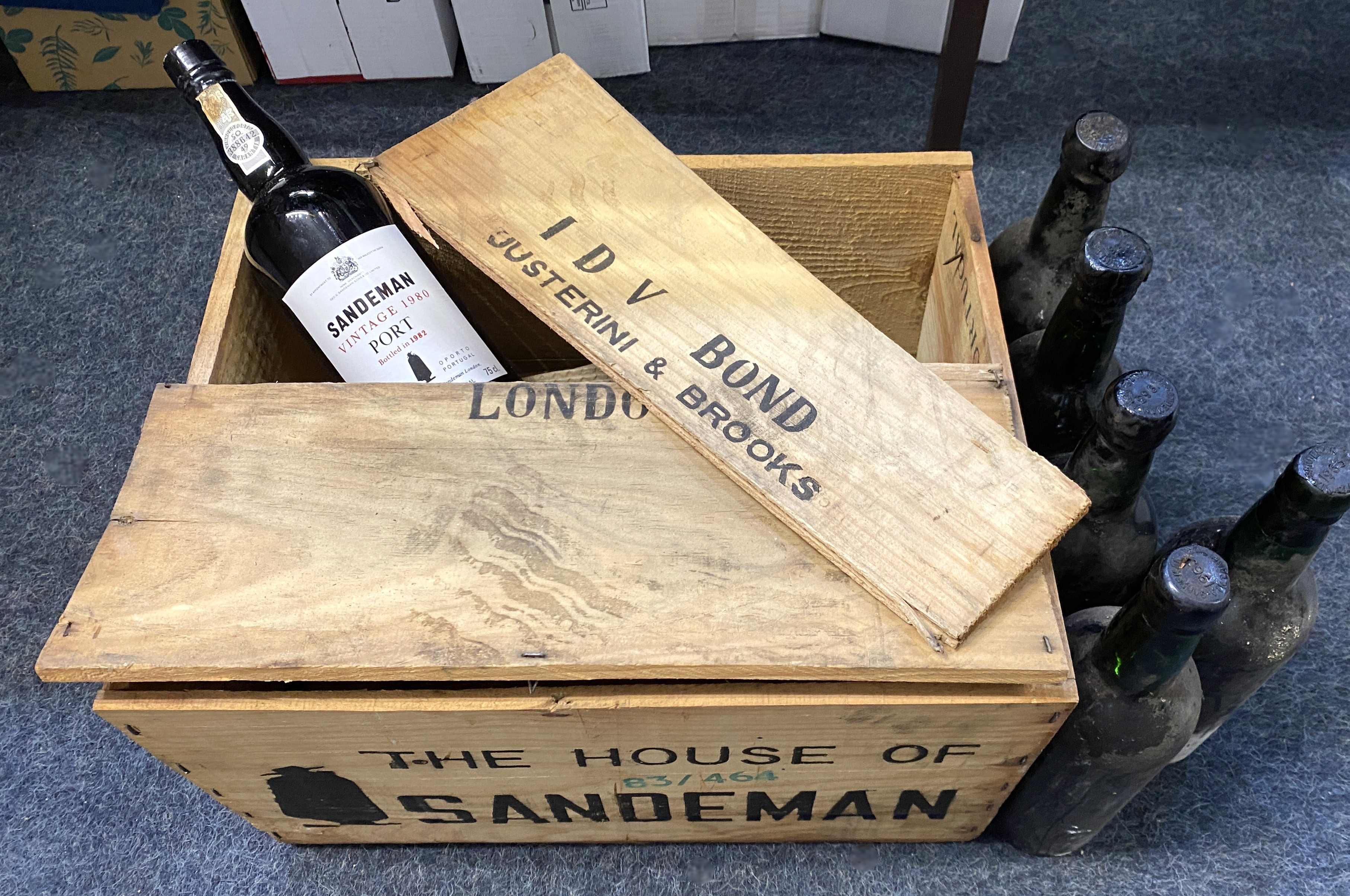 Port: Twelve bottles of Sandeman Port Seven bottles of 1980 Vintage 75 cl (7) Five bottles of 1963 Vintage (AF lacking labels) (5) with 1980 partial wooden crate (AF)