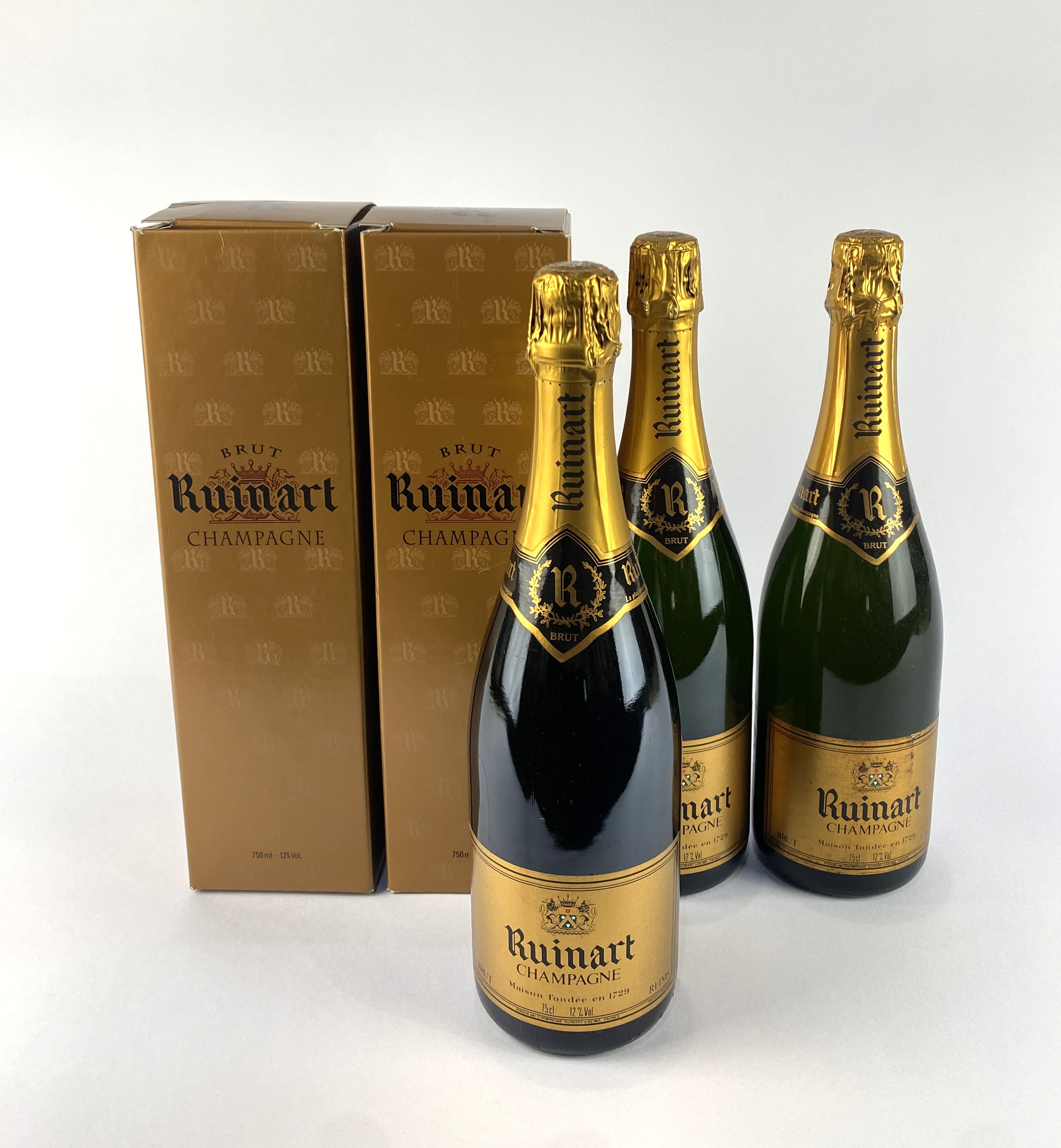 Champagne: Five bottles of Ruinart Brut Non-Vintage Champagne with branded cardboard boxes (Three lacking box) (5)