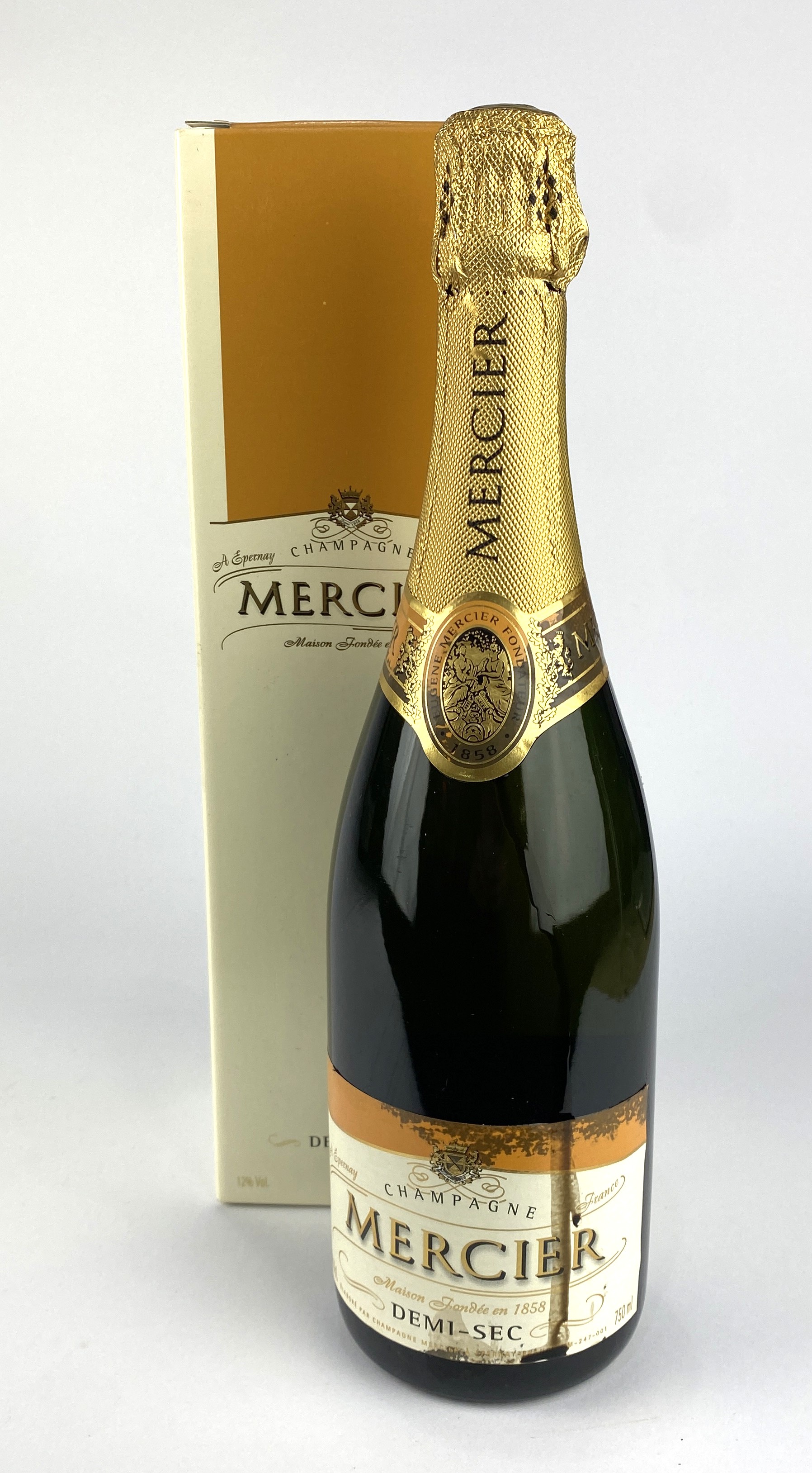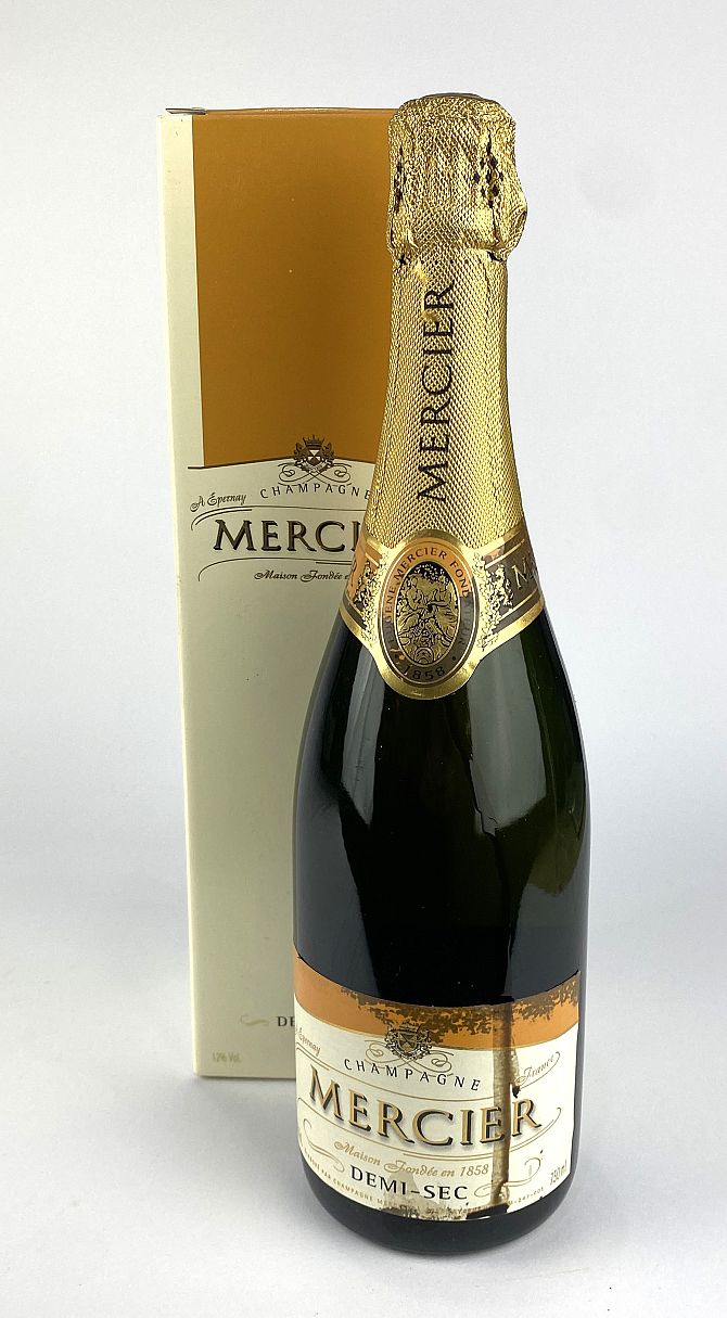 Champagne: A single bottle of Mercier Demi-Sec Champagne with branded cardboard box