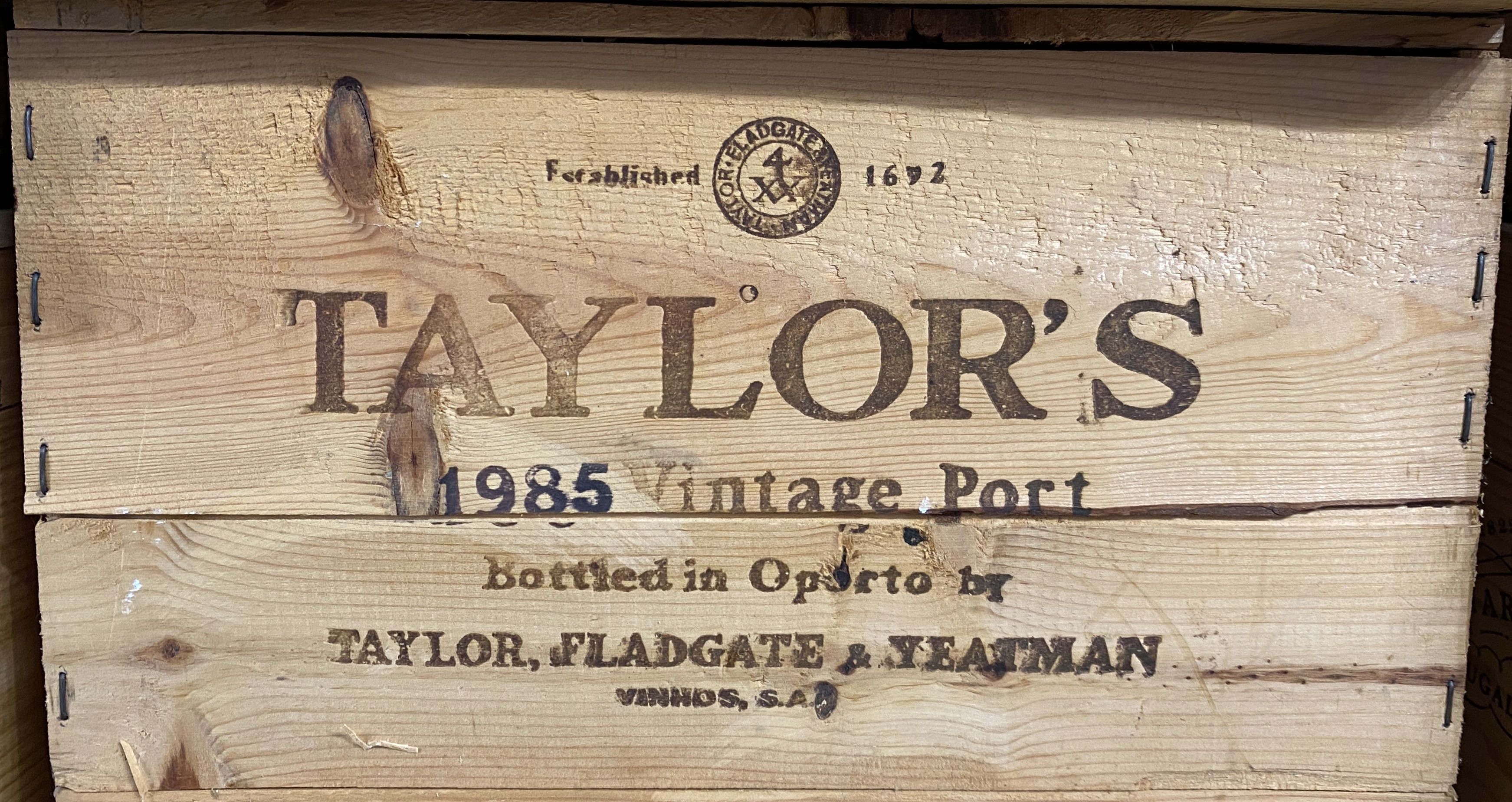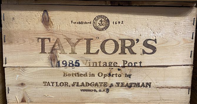 Port: an original wooden case of 12 bottles of Taylor's Vintage Port, 1985.