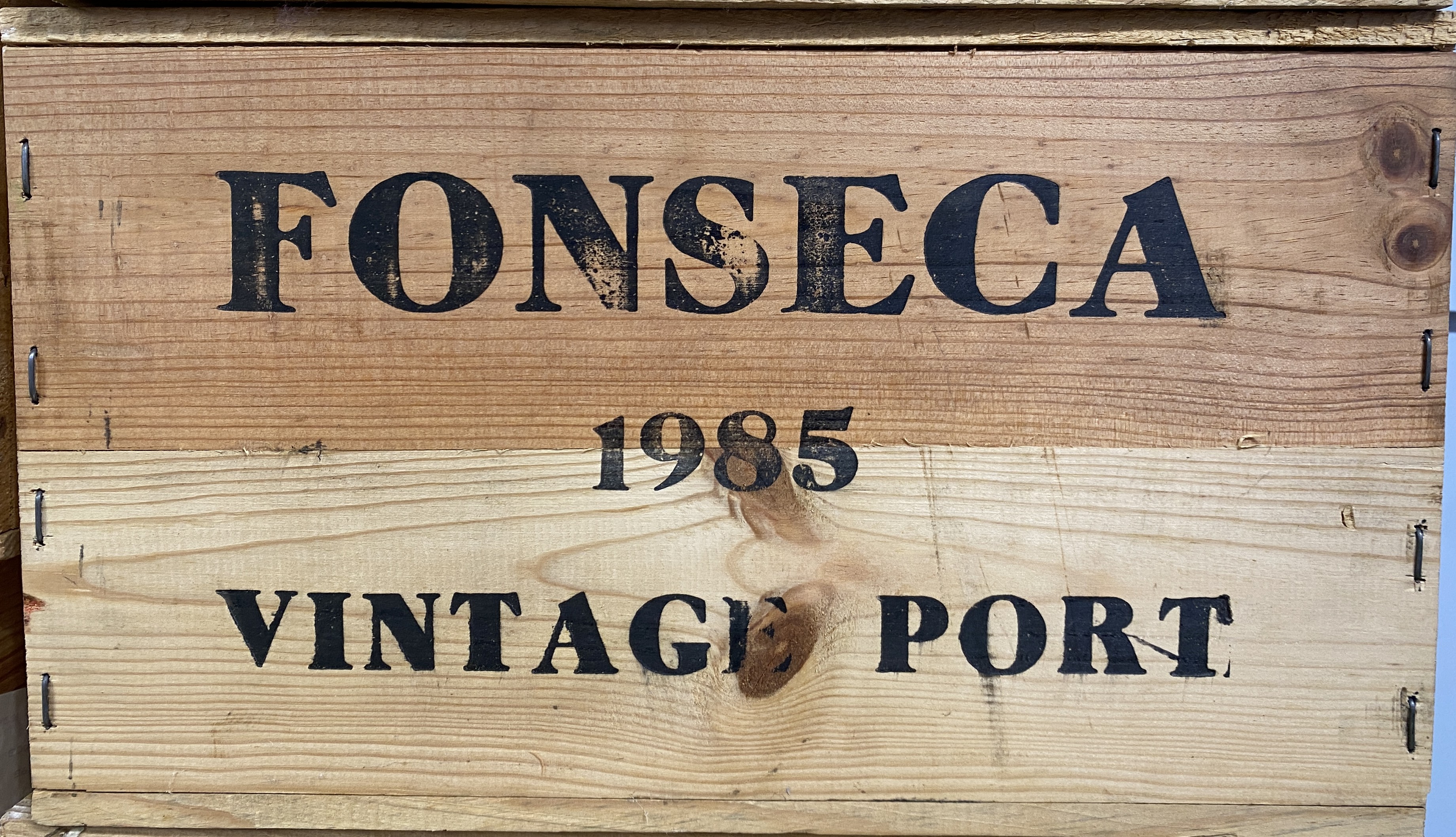 Port: an original wooden case of 12 bottles of Fonseca Vintage Port, 1985.