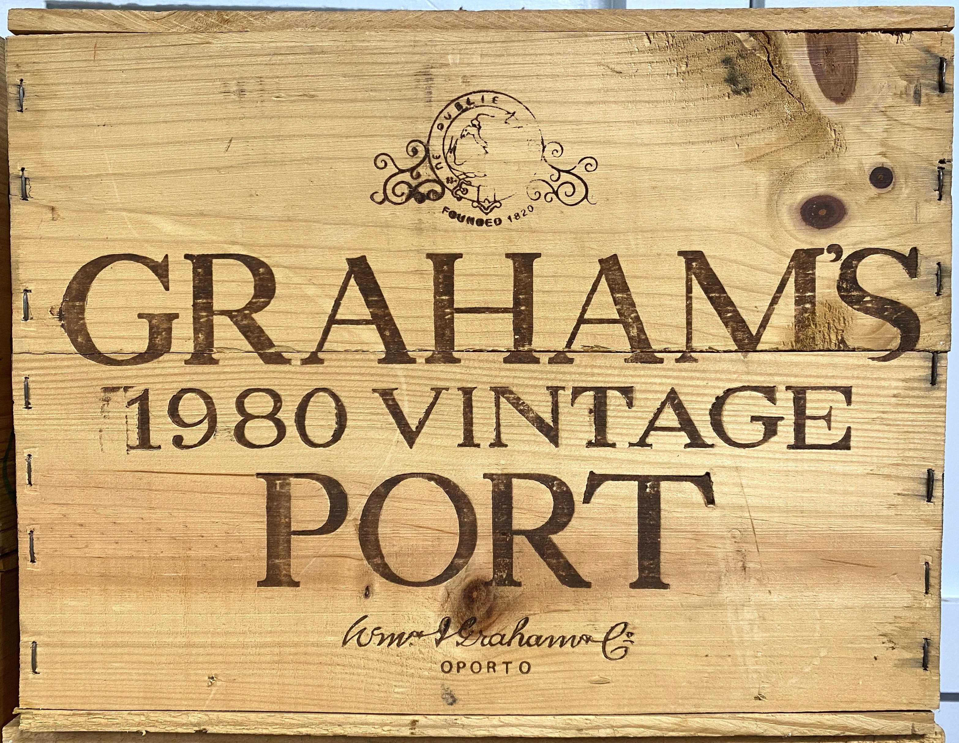 Port: an original wooden case of 12 bottles of Graham's Vintage Port, 1980.