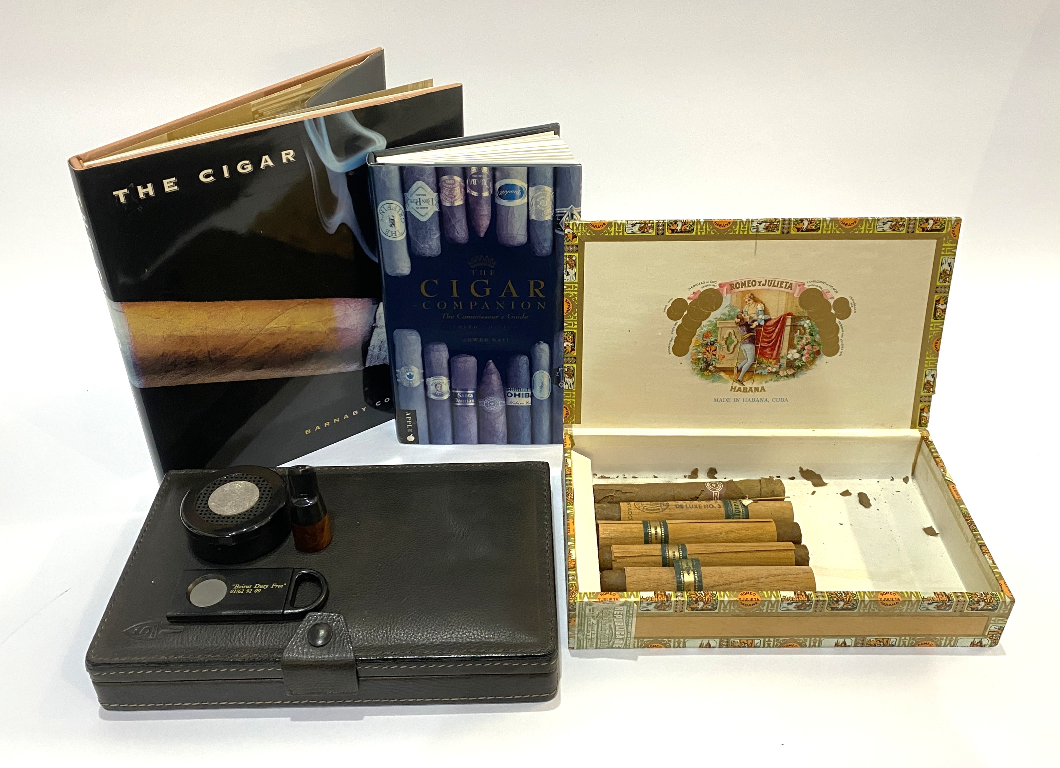 Cigars: An opened partial box of Romeo y Julieta Cedros de Luxe No. 3, containing five cigars and one Montecristo (AF), together with a travelling leather humidor, two volumes on cigars 'The Cigar Companion' and 'The Cigar' (4)