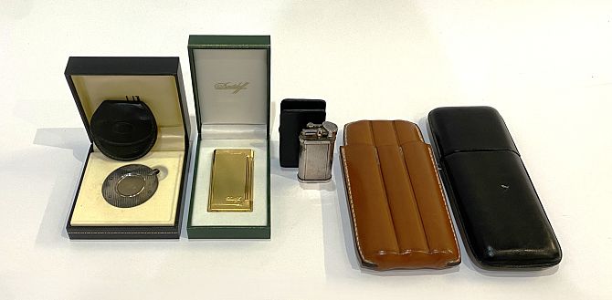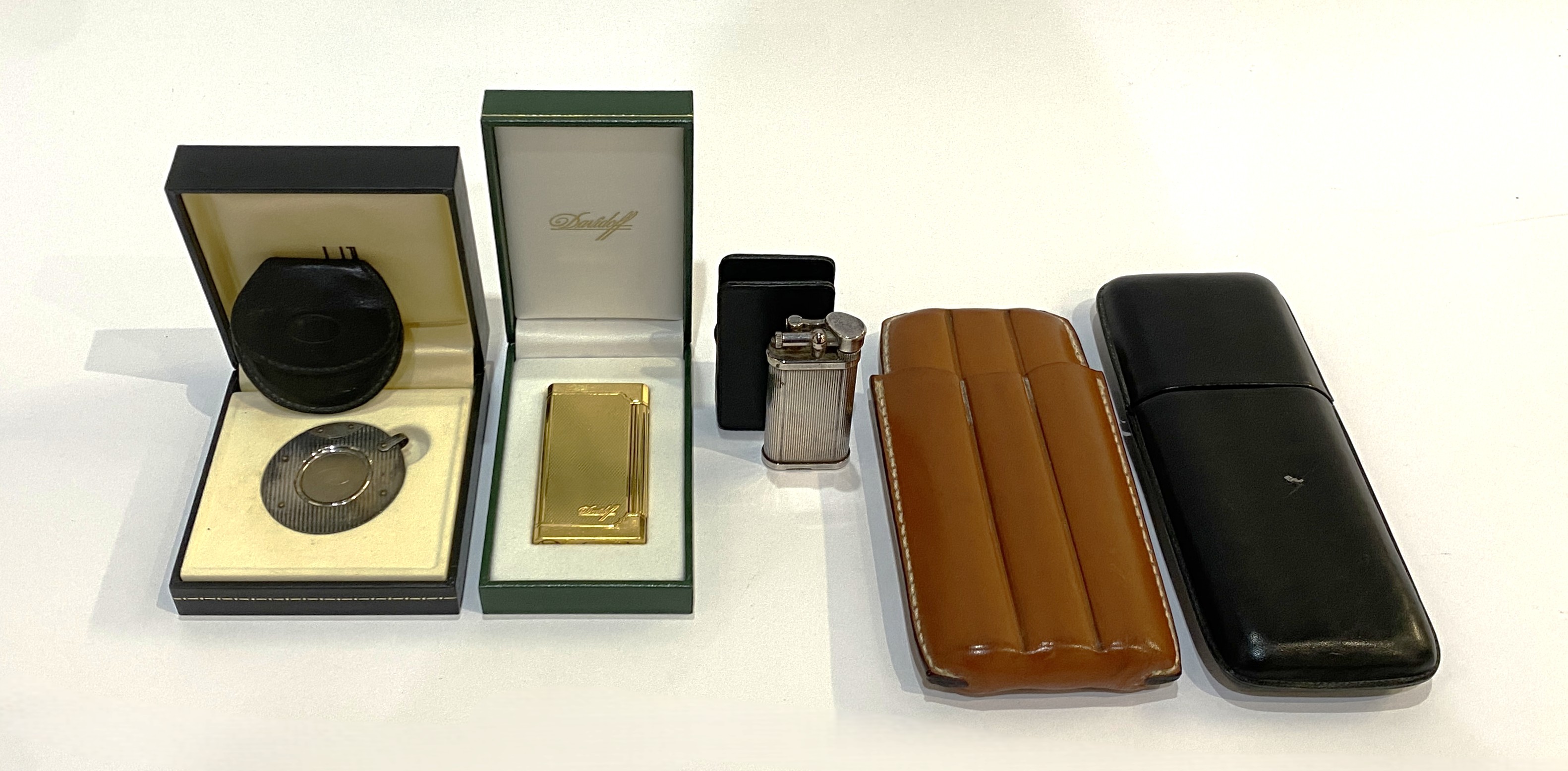 A vintage Dunhill stainless steel lighter, ribbed body numbered 430159, together with an Alfred Dunhill steel cigar cutter, with leather case, boxed, with card sleeve; a Davidoff gold tone lighter, within box and card sleeve, with corresponding Davidoff leather lighter case and two leather cigar cases (6)