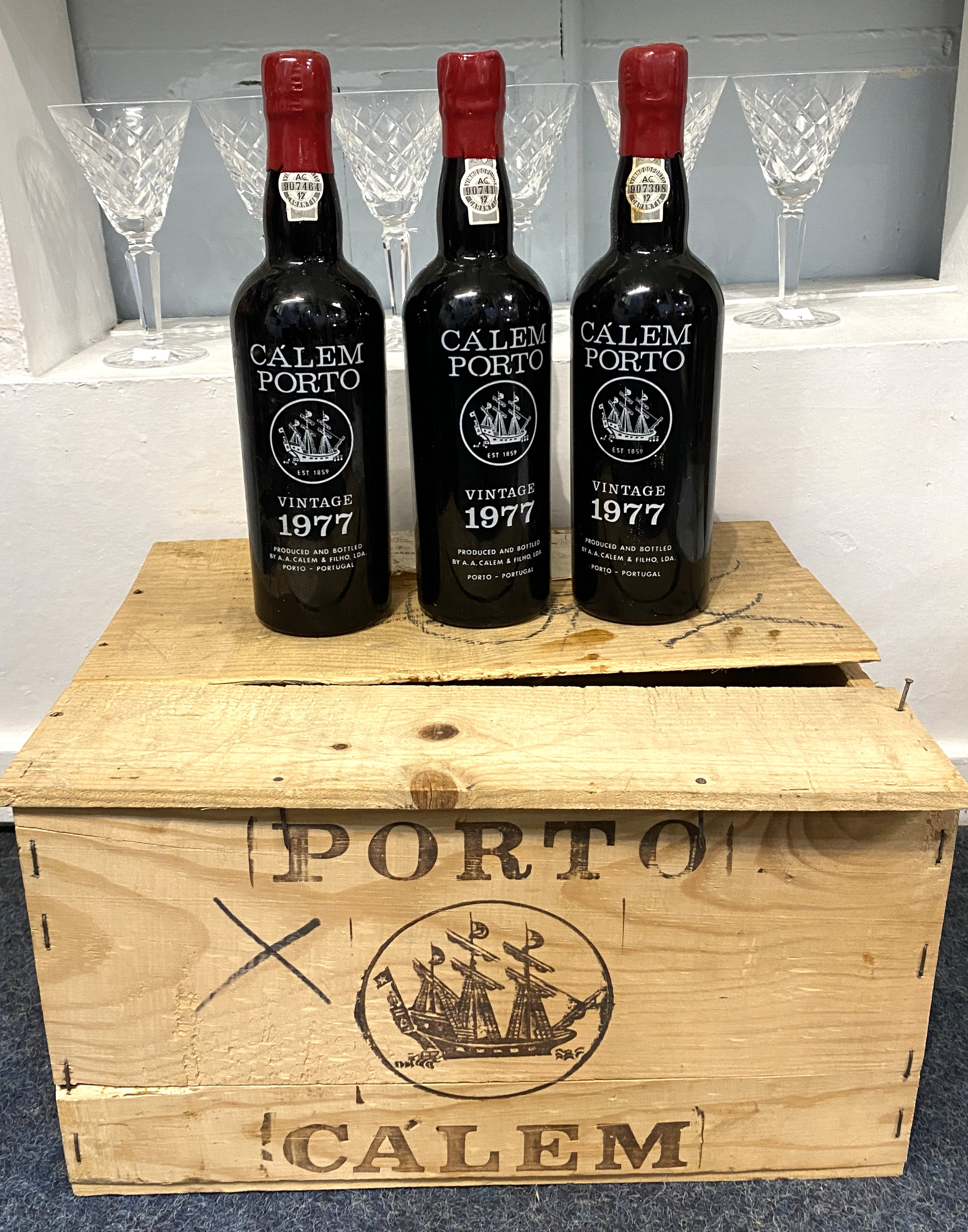 Port: Three bottles of 1977 Cálem Porto Vintage Port (3) with partial wooden crate (AF)