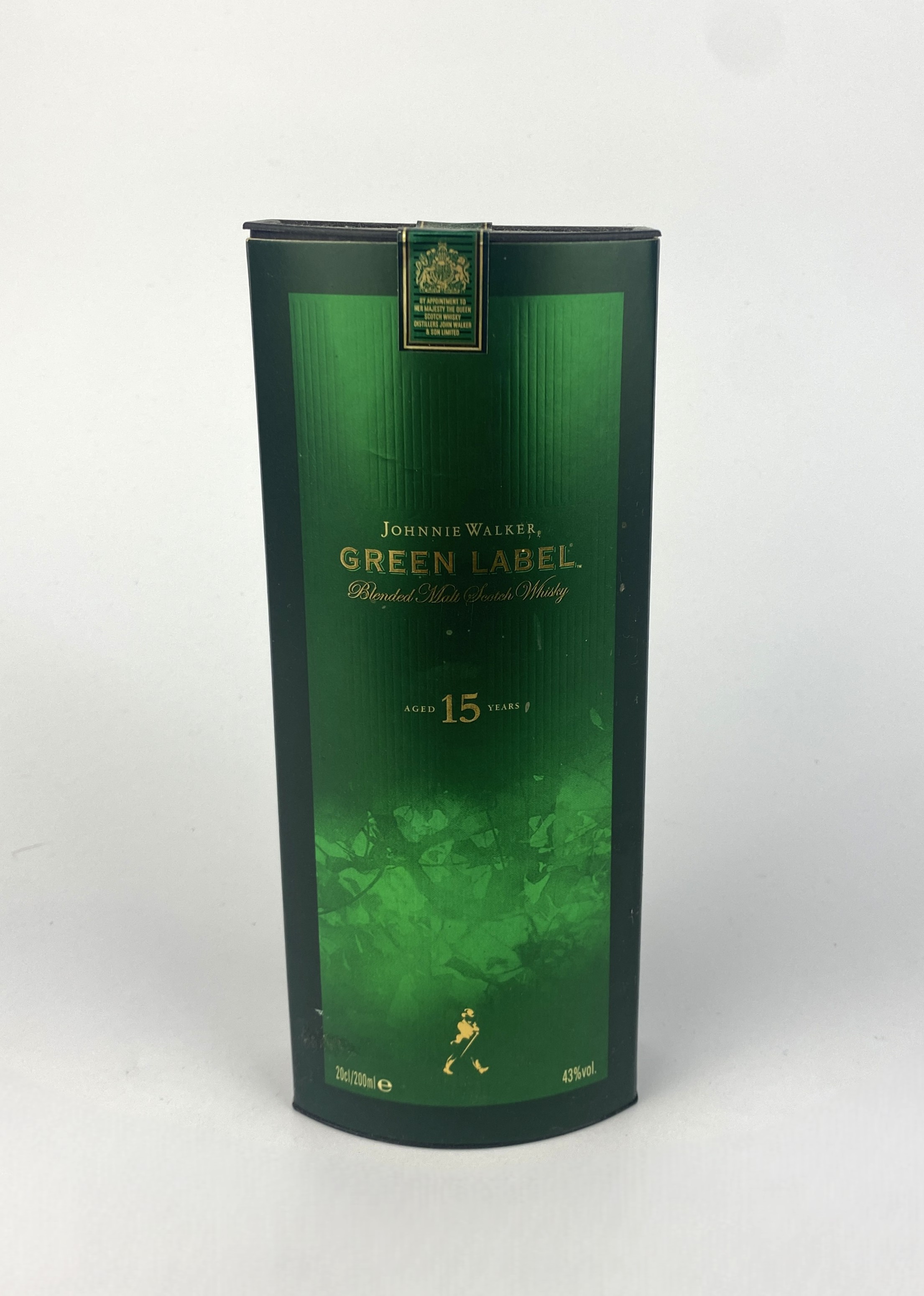 Whiskey: A single bottle of Johnnie Walker Green Label Blended Malt Scotch Whiskey 200ml in a sealed branded cardboard box