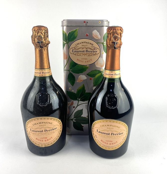 Champagne: Two bottles of Laurent-Perrier Non-Vintage Cuvee Rose Brut Champagne (2) with one unsealed branded metal tin box